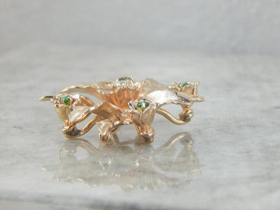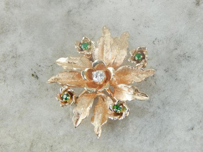 This beautiful piece can be worn as a pin or a pendant, a versatile and colorful antique from the Retro Era! The center stone is a bright, glowing diamond! We've set deep green, perfectly matched Demantoid garnets around the rim, for a spark of traditional color.