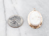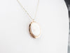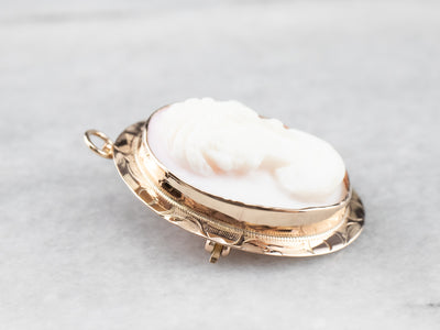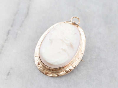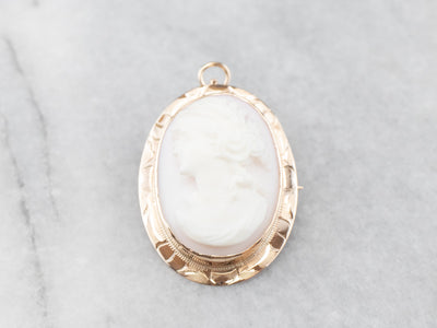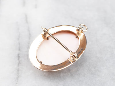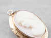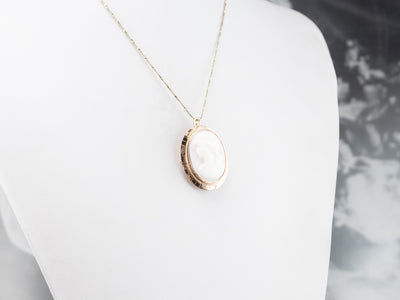 This lovely pendant is crafted in wonderful tones of rose and pink with accents of creamy white! An Etched rose gold comprises the frame, while the cameo at the center is carved from a soft pink conch shell.