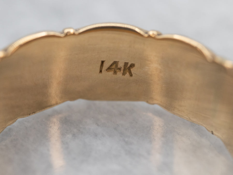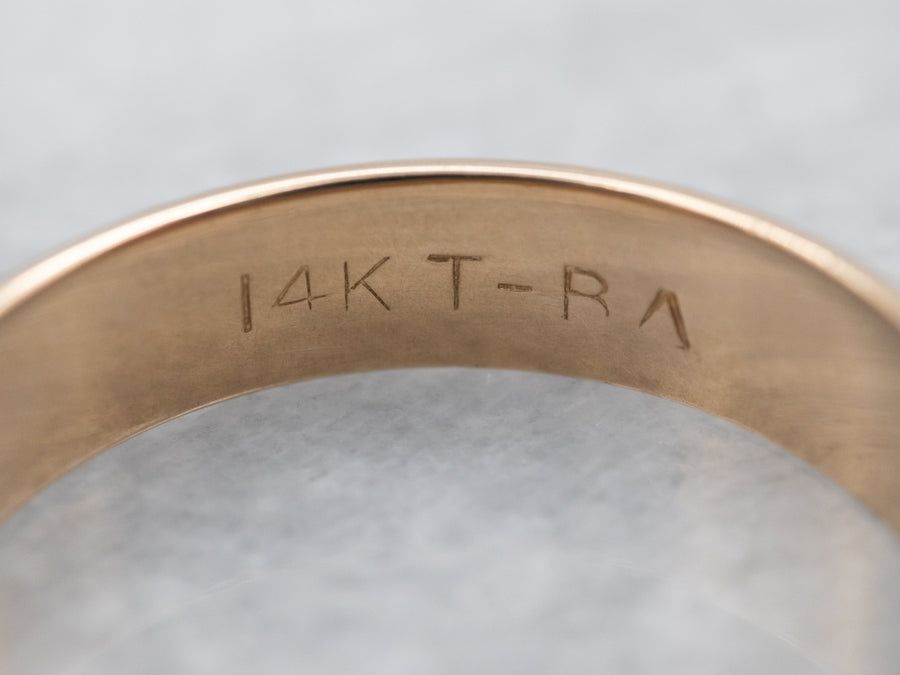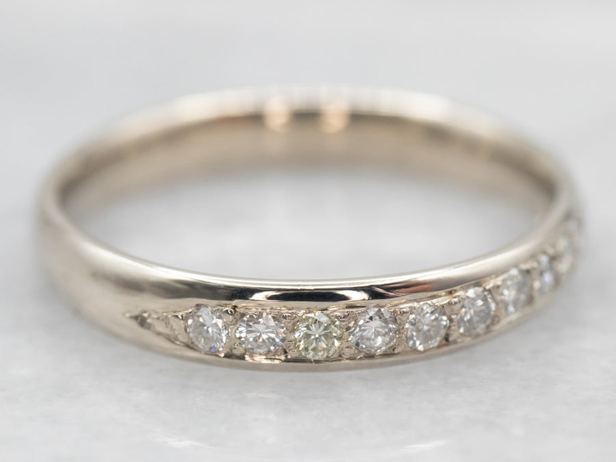 Simple and subtle, this comfort fit band features a low dome on top and a beautiful, soft polish. The profile and finish are simple, with just a milgrain decoration, giving this piece a nice profile for a man or a woman. This band has a perfect polish and is ready to wear.