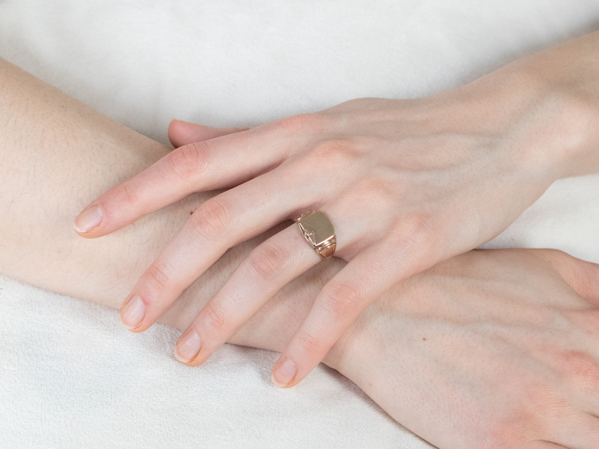 Classic and traditional, this vintage military-themed signet ring is bold and sleek with a perfect polish. Easy to wear, this 10 karat gold piece is sure to be a conversation starter!