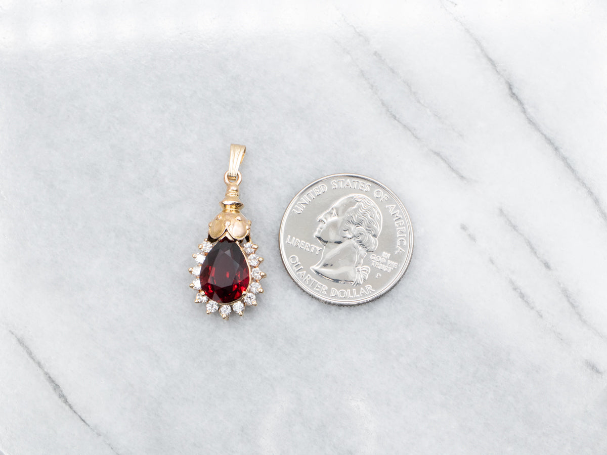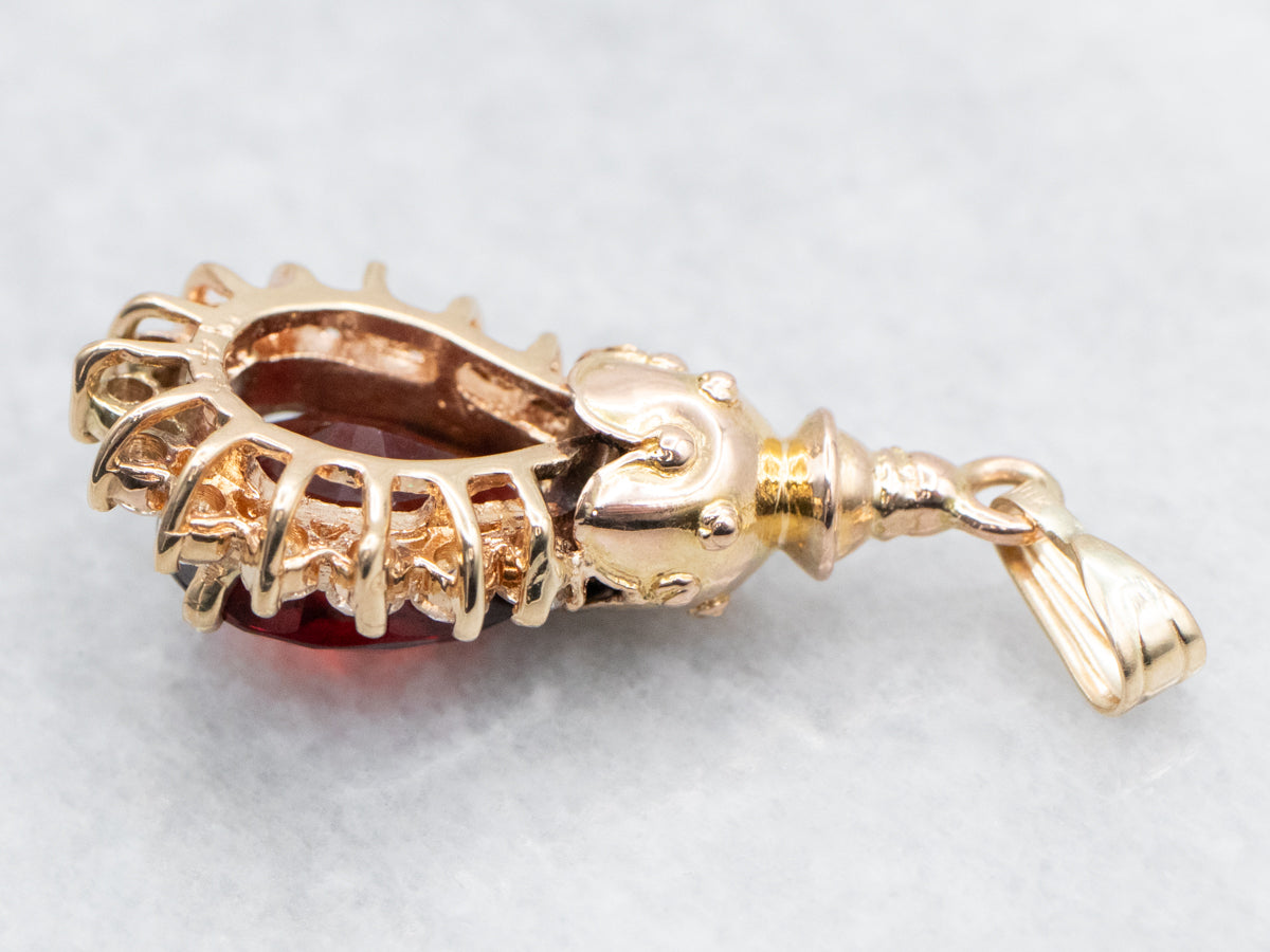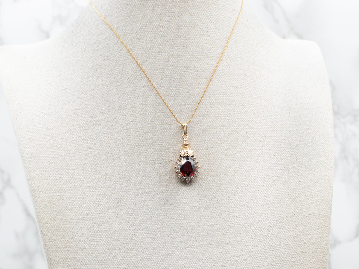 This pendant features a beautiful garnet topped with an ornate gold piece finished with a halo encrusted with diamonds. Wear this timeless piece of jewelry to elevate any look with elegance and sophistication.