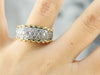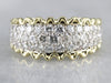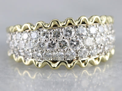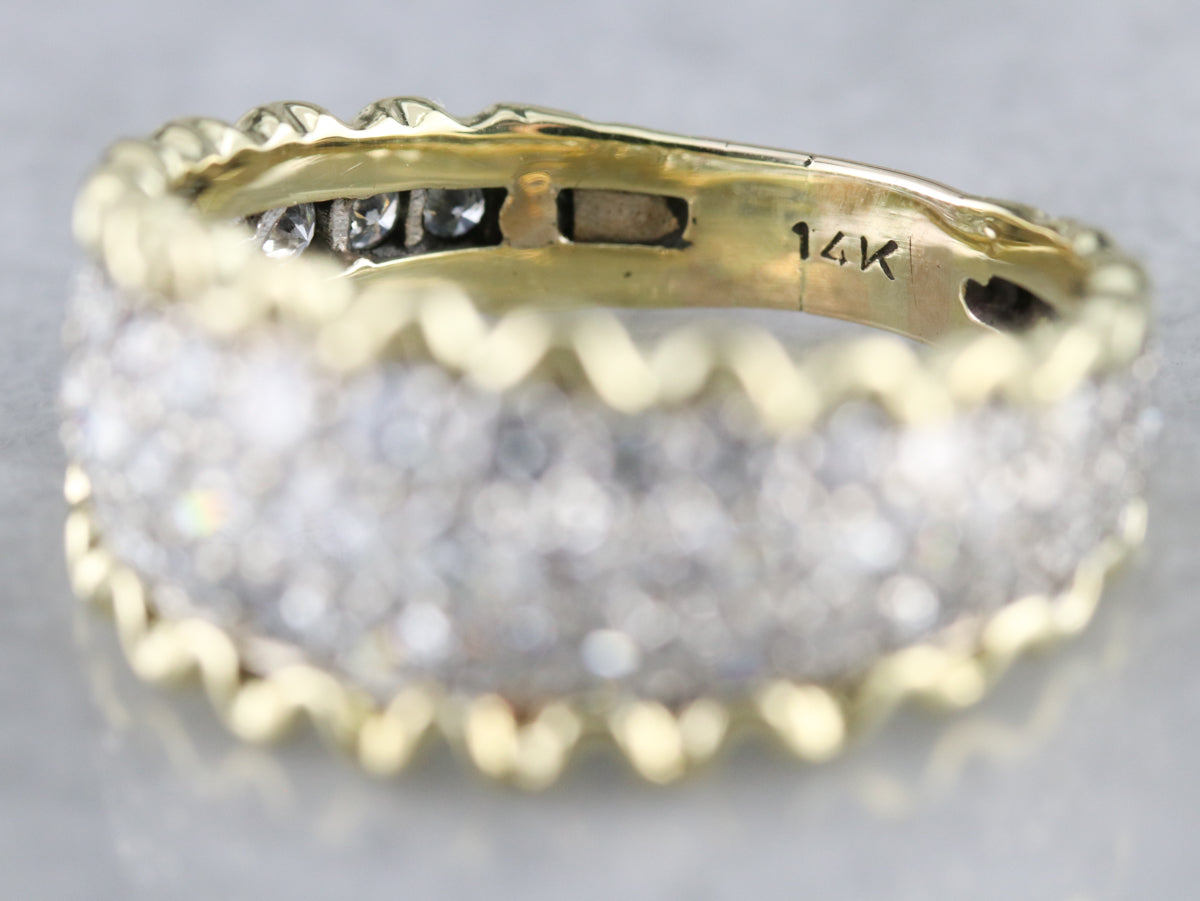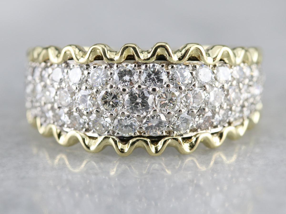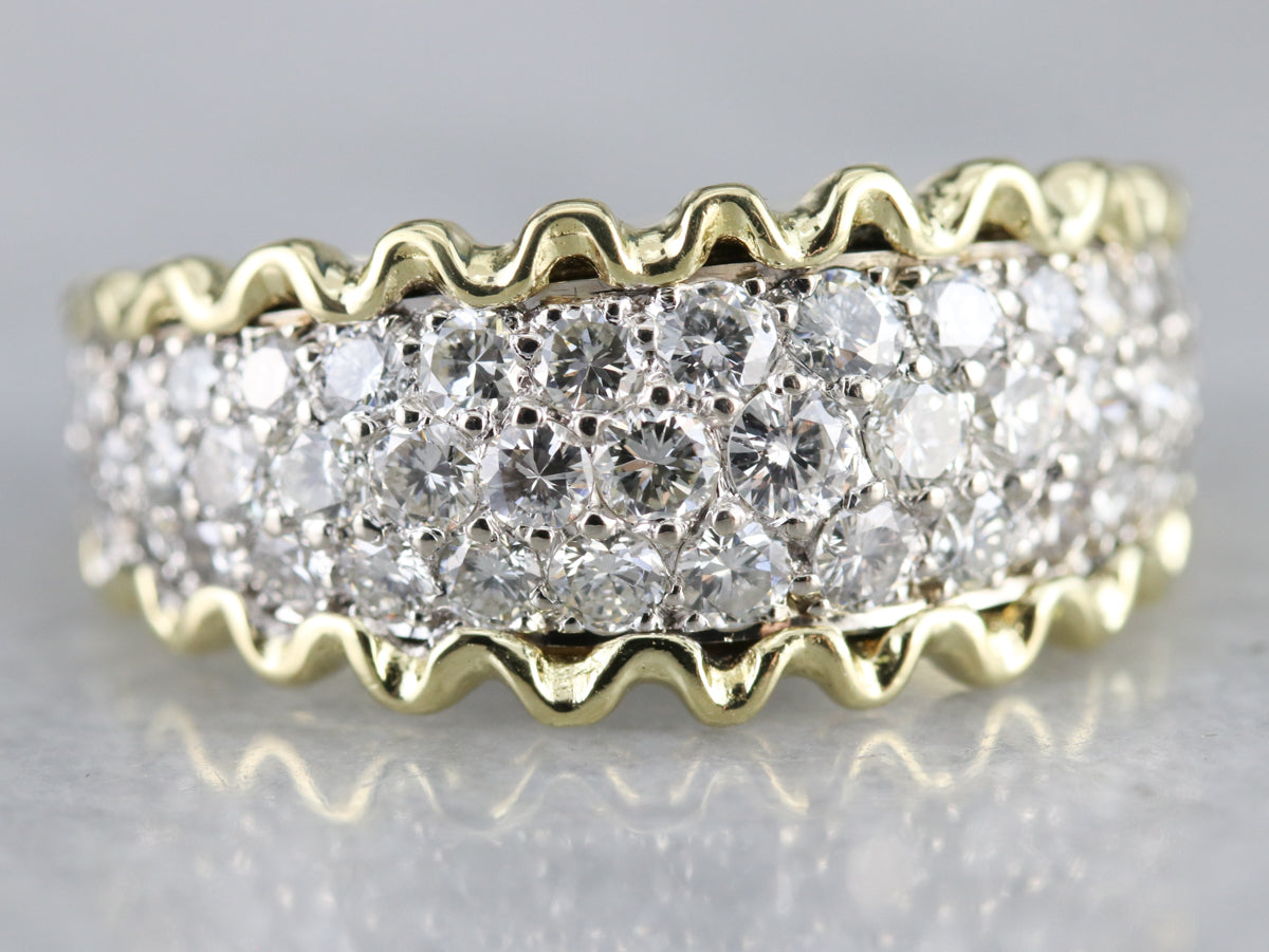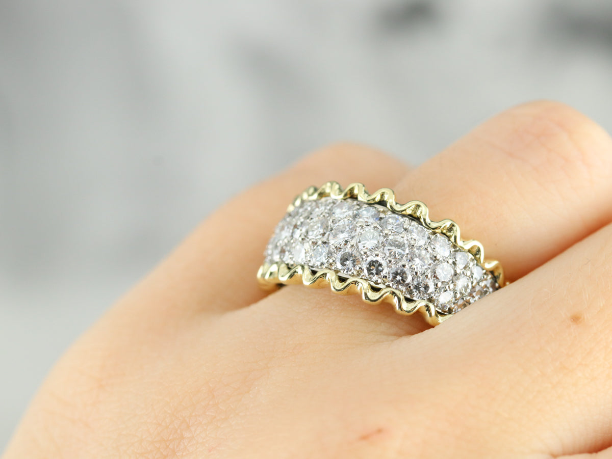 This luxurious band is bright and substantial enough to wear alone, as a right-hand band or cocktail ring. Paired up with the right engagement ring, this would make an interesting and unique wedding piece as well! The scalloped mix metal gold has a rich luster, and the diamonds flow across the hand in a river of light!