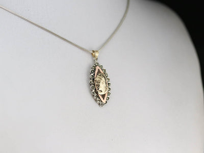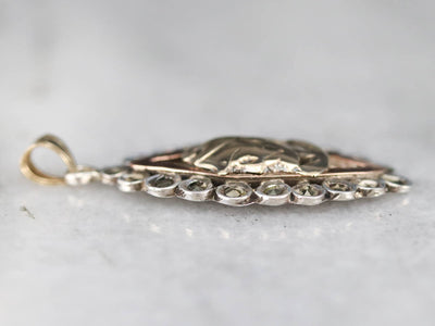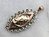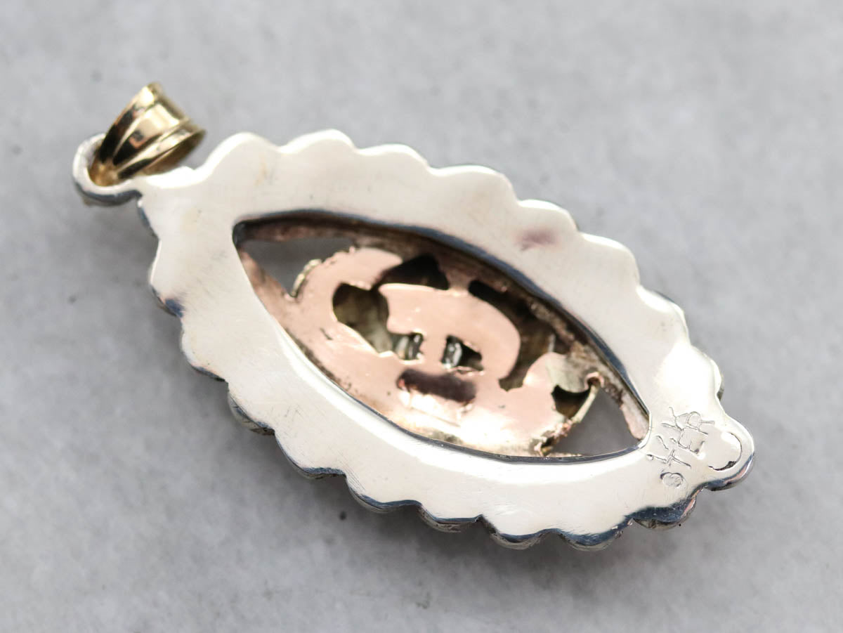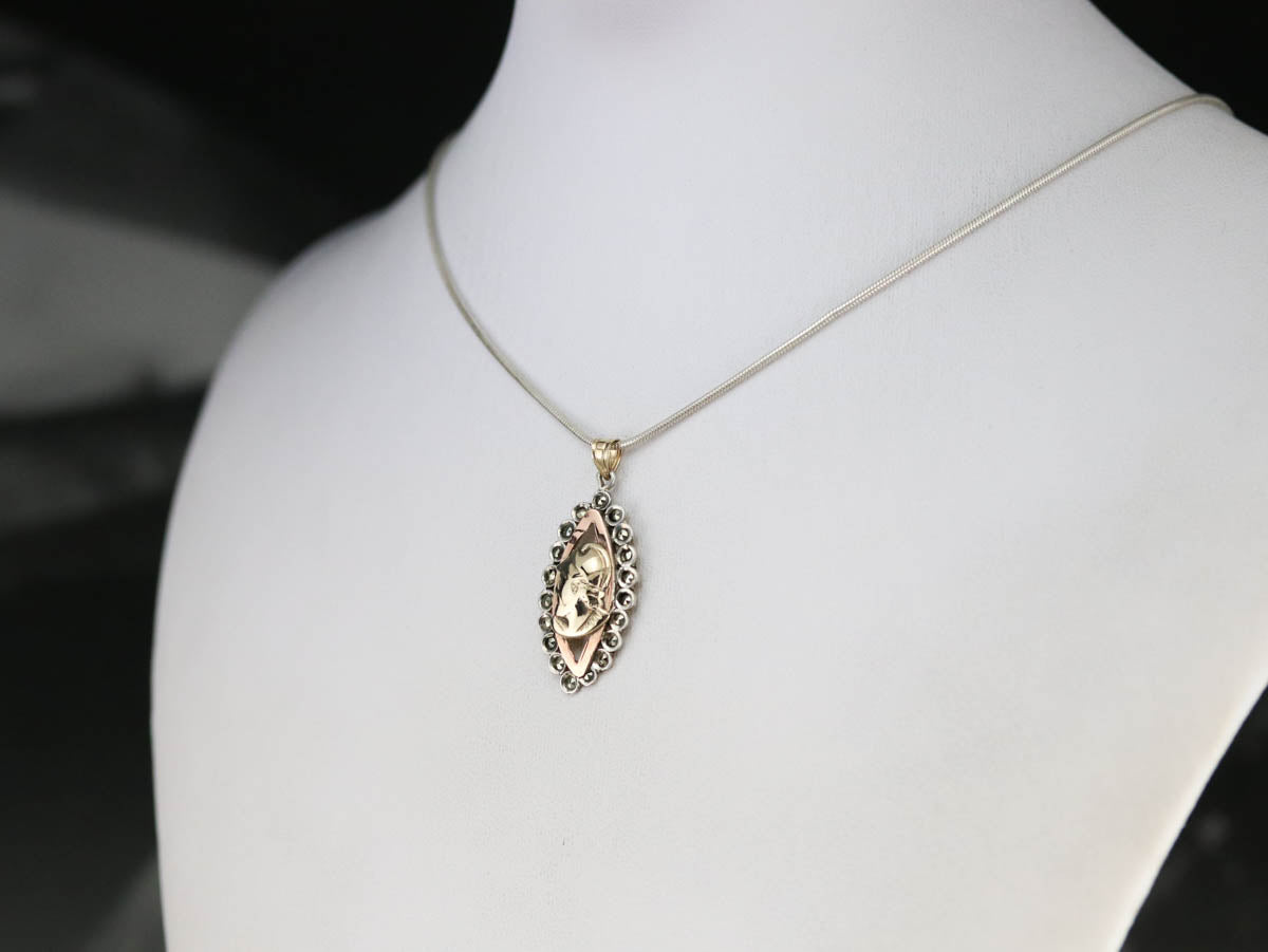 This funky pendant is one-of-a-kind! Using jewelry components from different eras, we've created something entirely unique, using a classic Roman soldier motif as the centerpiece. A marcasite frame adds a touch of sparkle and highlights the marquise shape.