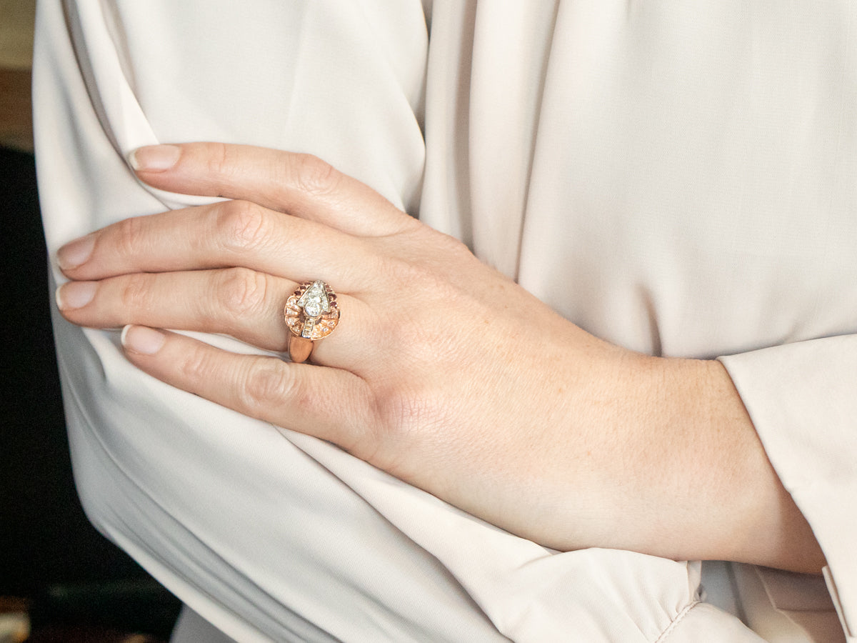 This eclectic ring perfectly blends the classic elegance of a European cut diamond with a modern mix of rose gold and platinum. Intricately studded with ruby, diamond, and fiery orange diamond accents, this strikingly unique piece adds a powerful statement to any outfit.