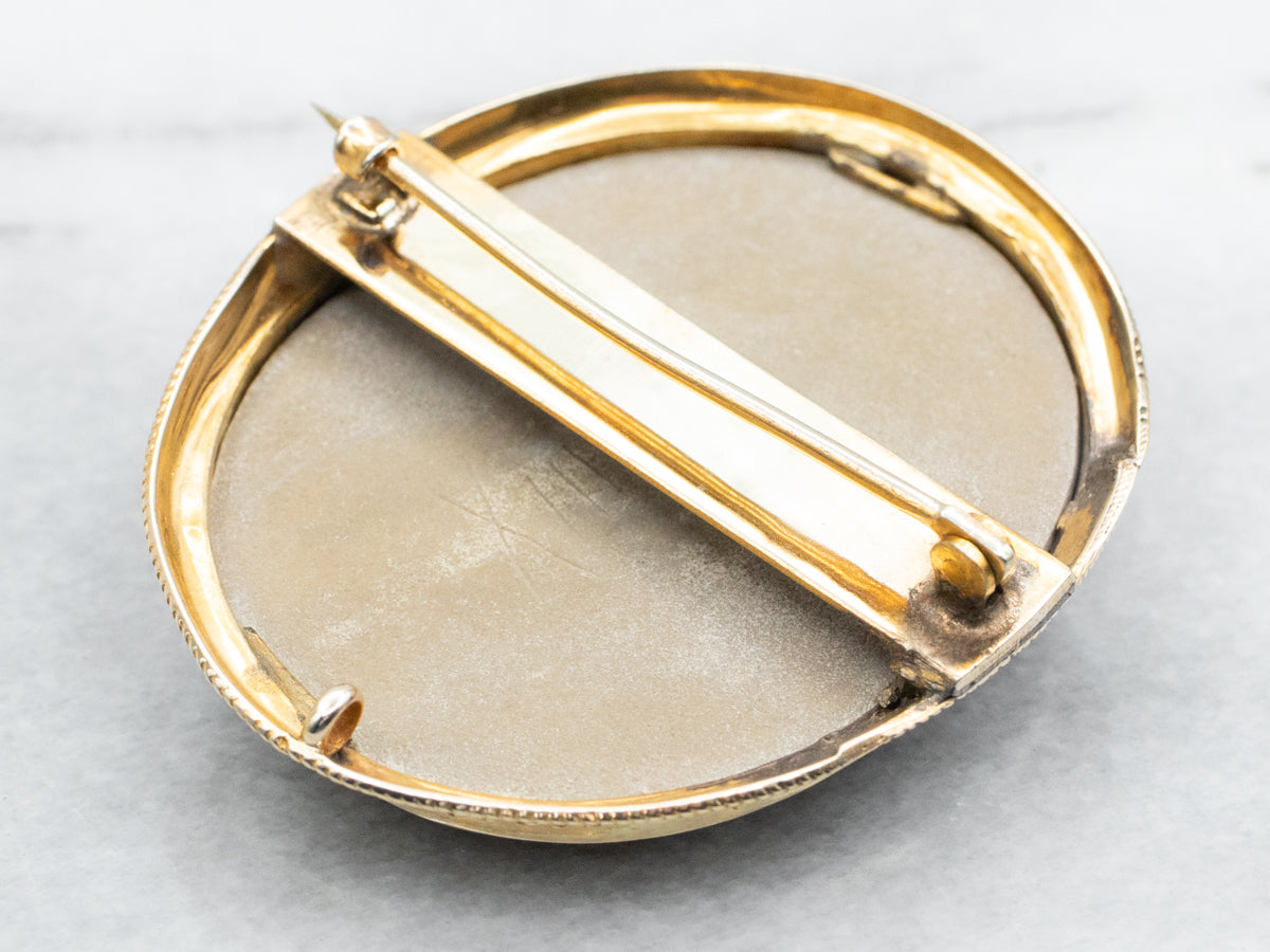 Metal: 10K Yellow Gold; Gold Fill Gem: Lava Cameo Gem Measurements: 34.7 x 41.7 mm, Oval Measurements: 39 x 47 mm