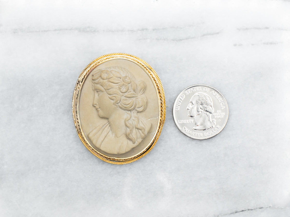Add some whimsy to your wardrobe with this brooch! Made with both yellow gold and gold fill, this brooch features a unique lava cameo design depicting a woman with flowers in her hair. It's the perfect accessory to add a touch of playfulness to any outfit!