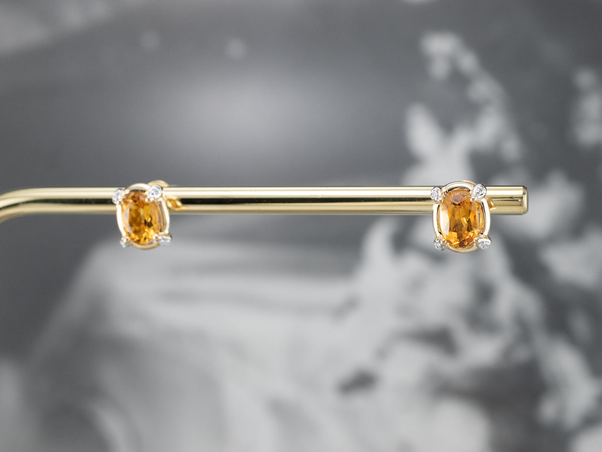 Sunny, autumn-shaded color and light gleam from the edges of these pretty yellow, citrine gems! Set into sparkling diamond stud earring mountings, these are twinkle with color and perfectly sized to transition from day to evening.