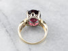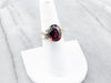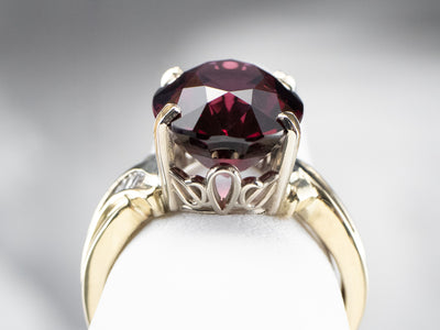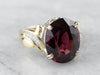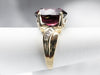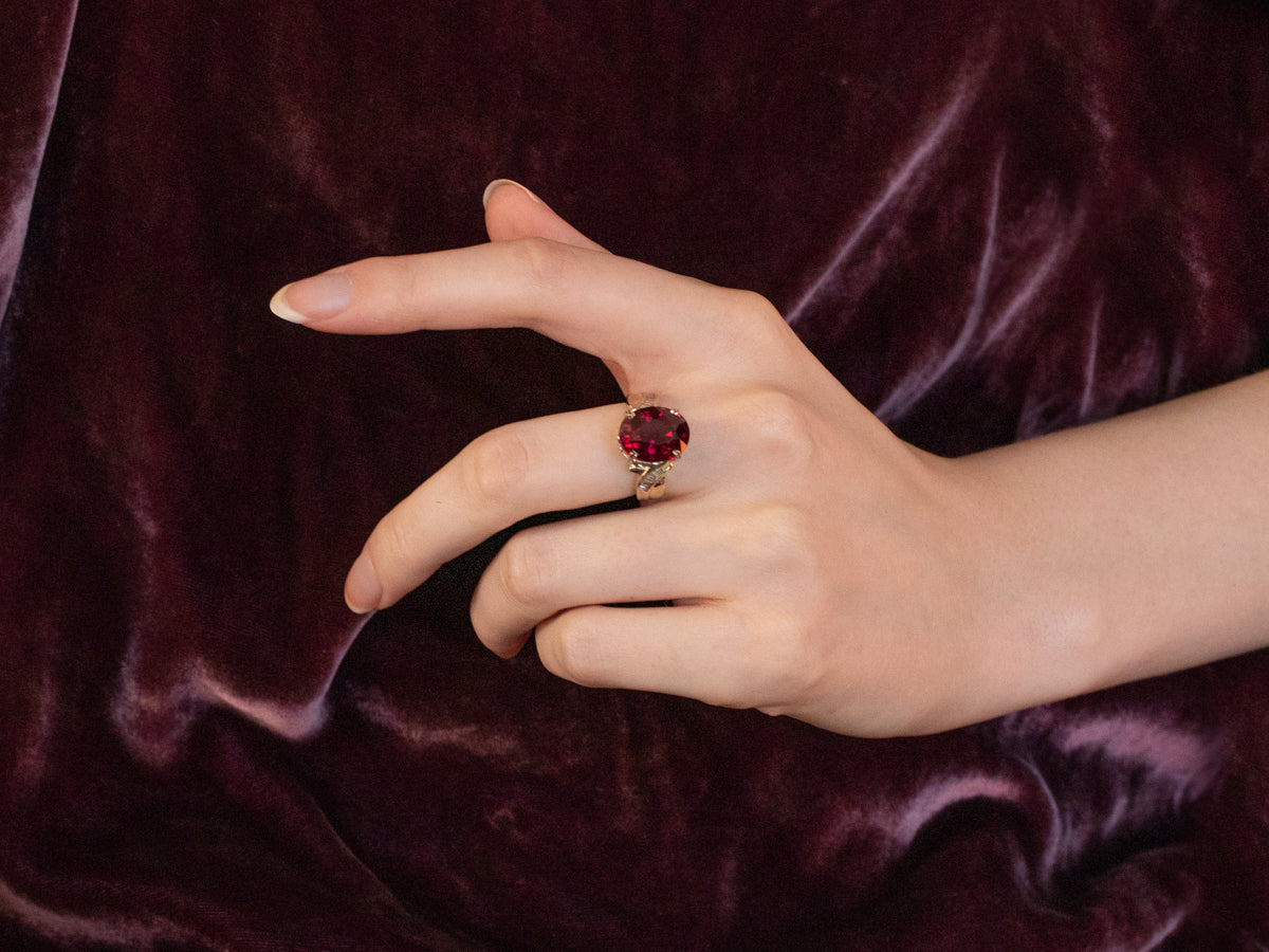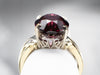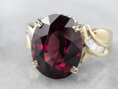 This vintage yellow gold bypass style mounting has simple baguette diamonds sweeping shoulders on the sides and secure prongs. We've set this piece with a deep red garnet. The color of this stone is deeper, a rich, crimson-cranberry hue. This would make a lovely cocktail ring, and is also a sturdy enough stone to wear every day!