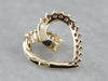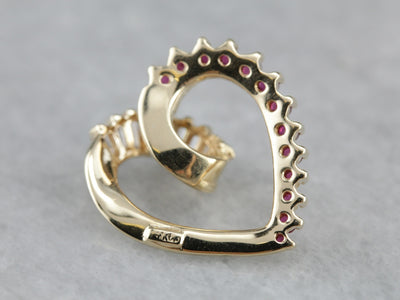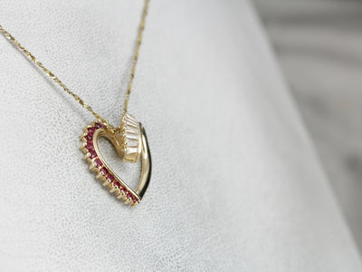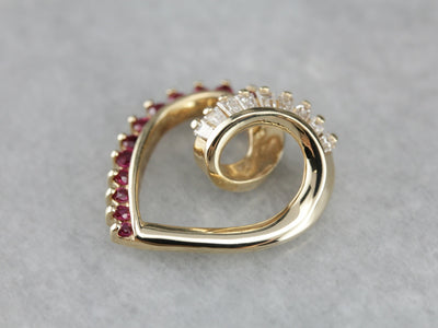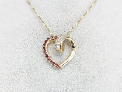 Detailed and yet simple, the classic symbol of love has been worked here as a beautiful pendant! The metal is 14K yellow gold, and the crafting is of the highest quality. Set all the way around with prong set rubies and baguette diamonds, this would be a wonderful gift for a mother of the bride or even for the bride herself!