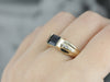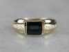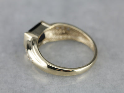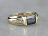This is an interesting ring, which would work well as a modern style engagement ring or an everyday piece. The setting is contemporary, however, we've set the dark blue sapphire in the center ourselves. The modernist cut of this stone lends itself well to this setting and the east/west orientation of the piece.