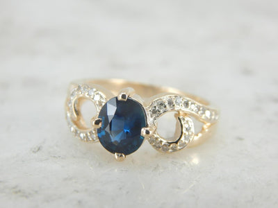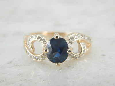 This contemporary, modern ring was made in the 1980's, but the style has classic details. This is a very wearable ring, suitable for every day. The profile is low to the finger, and the ring is lightweight and comfortable. Sapphire and diamonds are the hardest gems used in jewelry and this piece will remain lovely after years of wear. This would make a lovely birthstone ring, or anniversary gift!