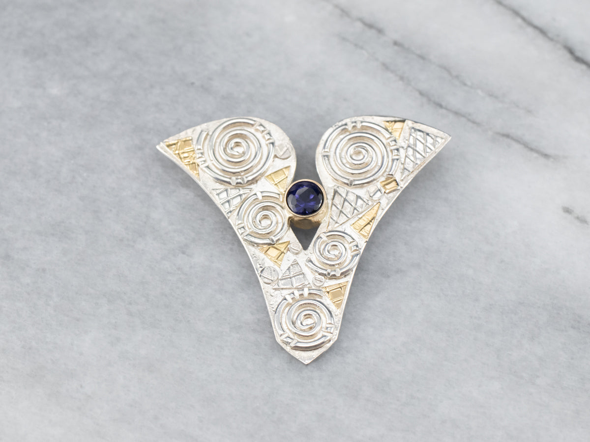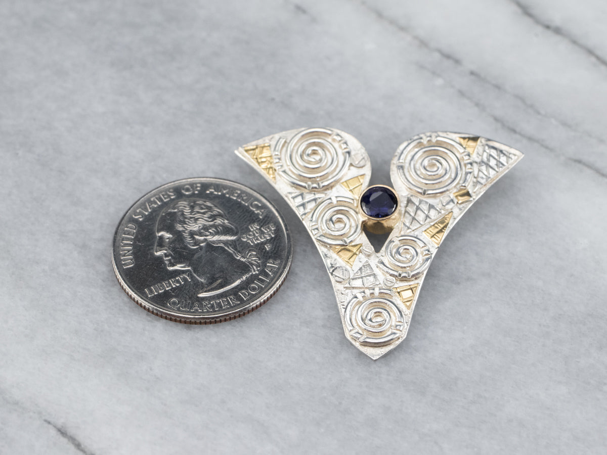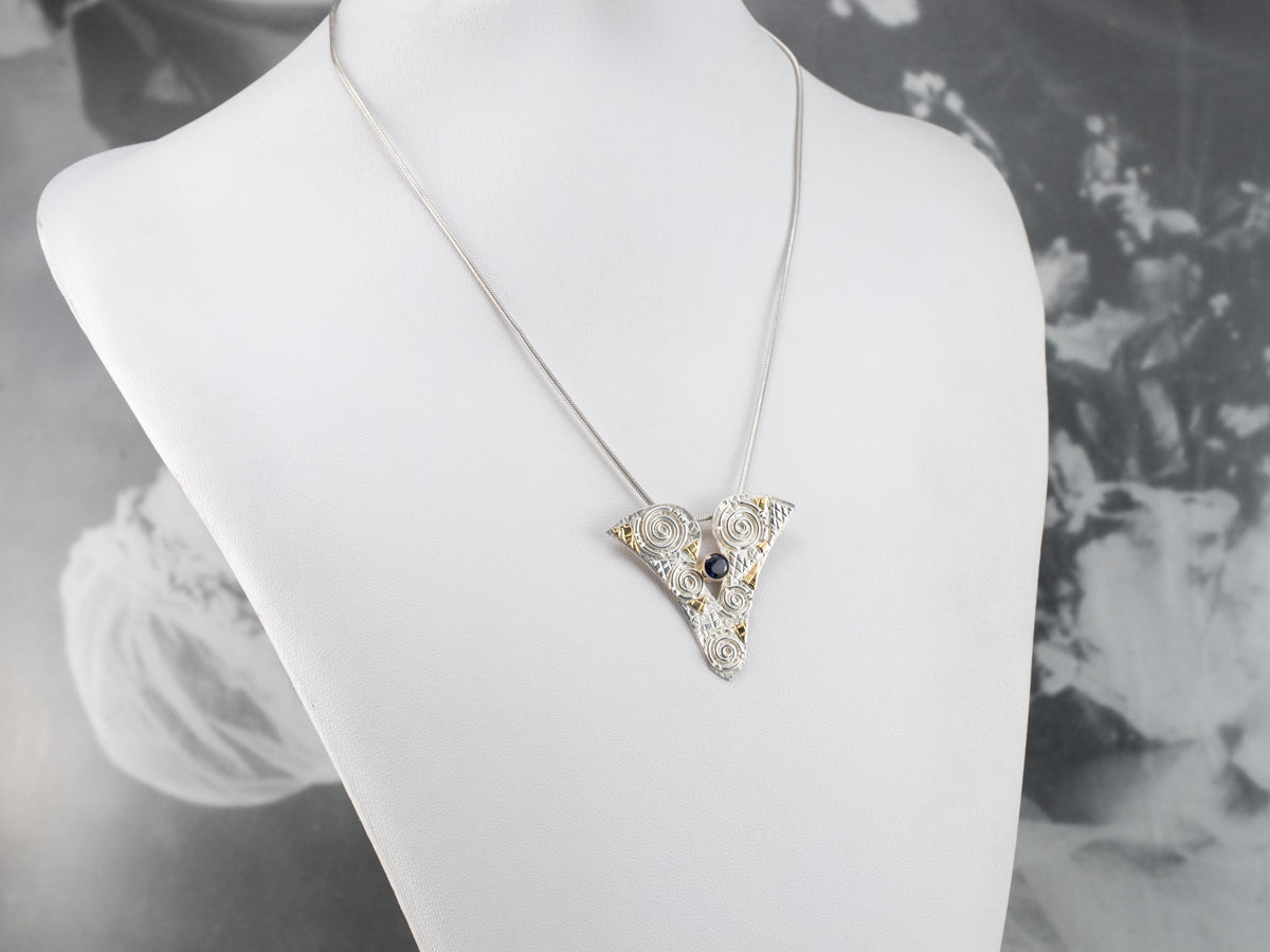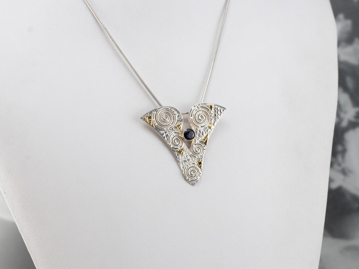This is a fantastic vintage piece that bears a stylized V-shaped design! The synthetic sapphire pendant is elegant despite the mechanical style. Textured sterling silver is accented with perfect triangles of yellow gold, combining a linear, industrial style with modern sophistication, perfect to dress up or down!