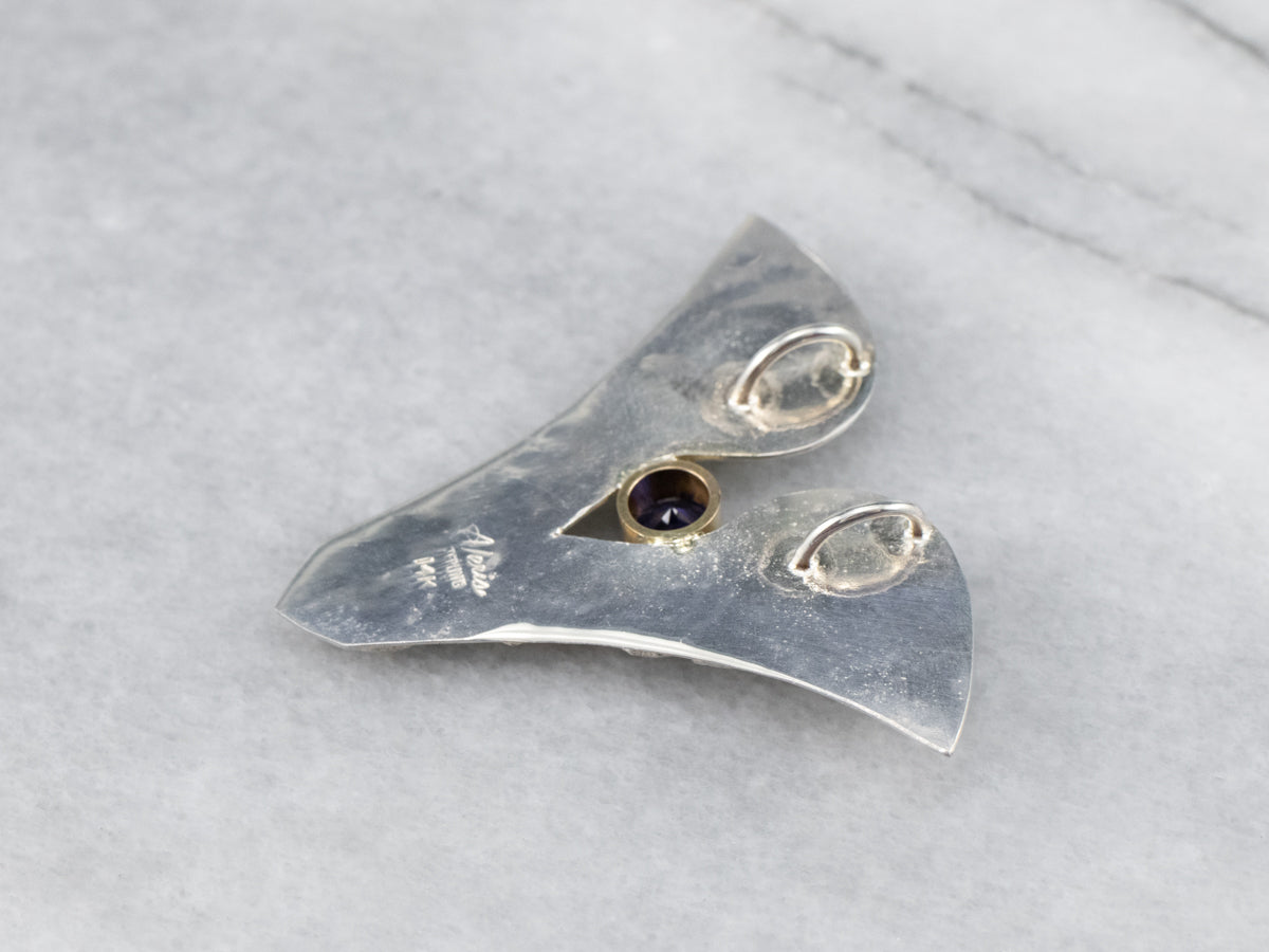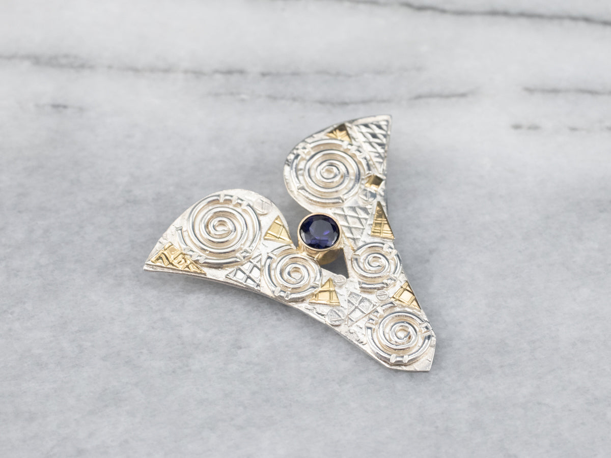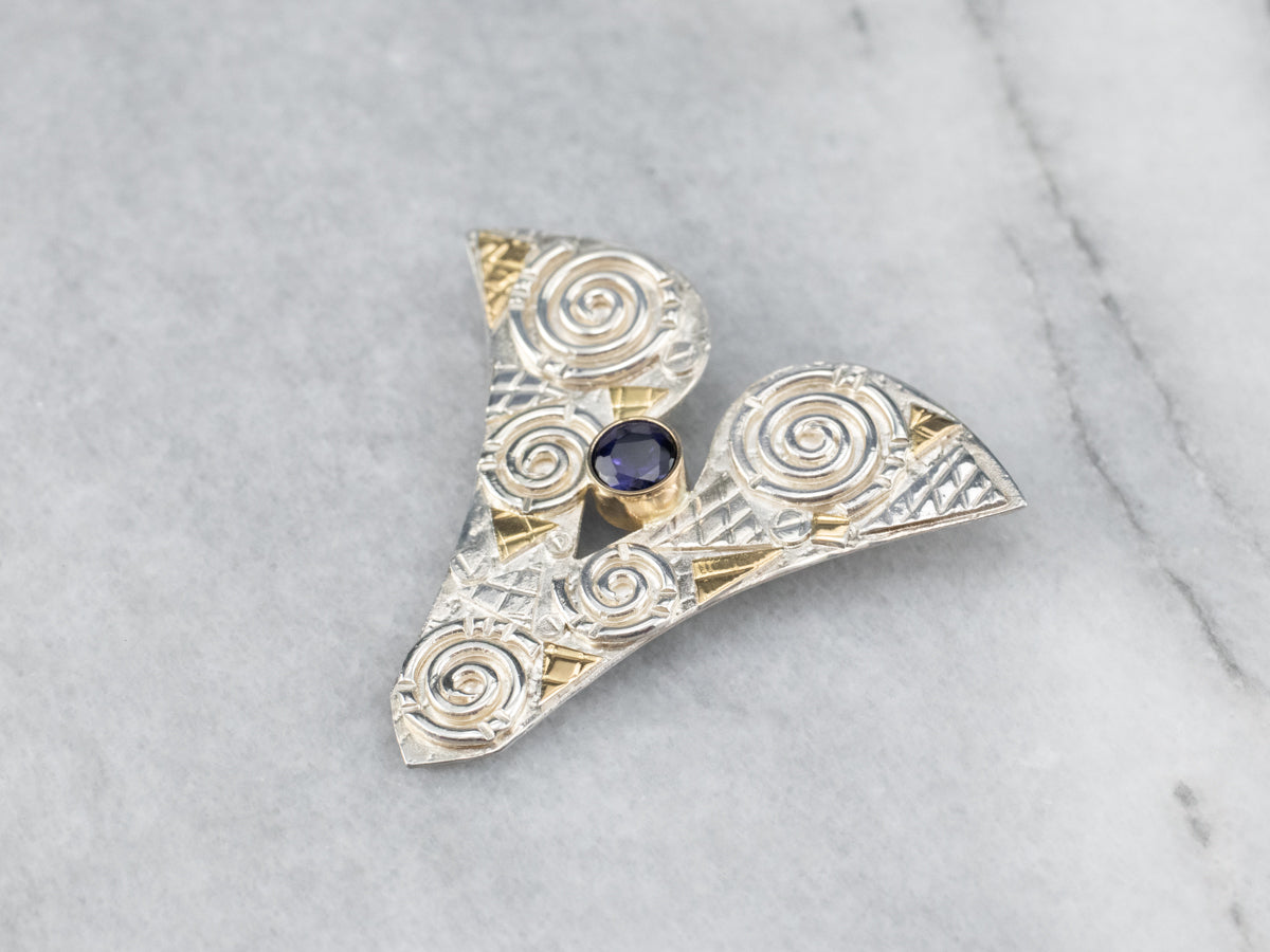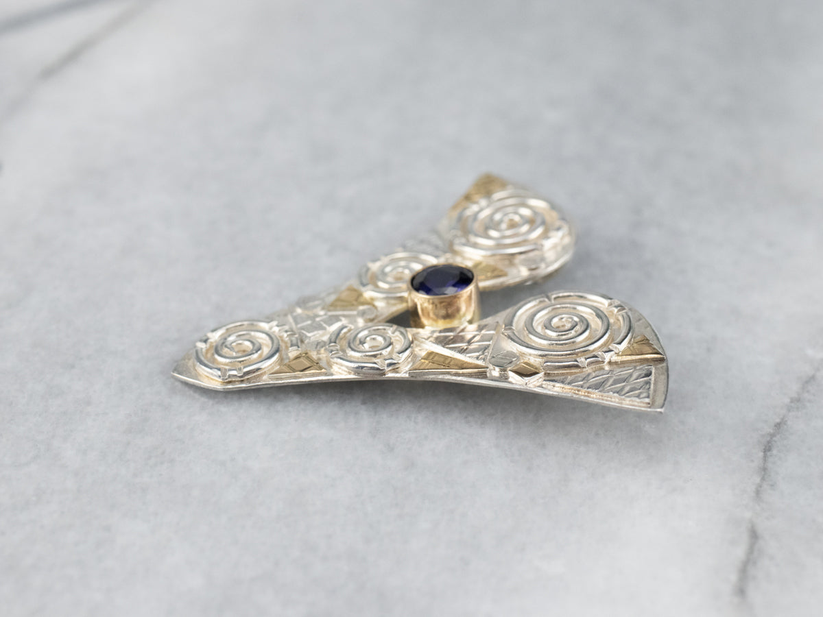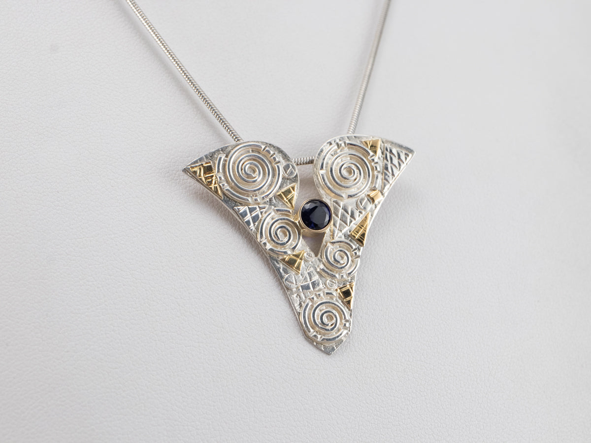 This is a fantastic vintage piece that bears a stylized V-shaped design! The synthetic sapphire pendant is elegant despite the mechanical style. Textured sterling silver is accented with perfect triangles of yellow gold, combining a linear, industrial style with modern sophistication, perfect to dress up or down!