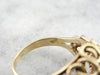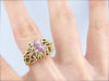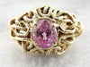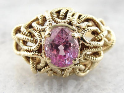 This vintage pink sapphire cocktail ring is bold and luxurious! This woven knot sits high on the finger, a filigree nest of beautifully textured strands. We've set the center with a bright pink sapphire from Sri Lanka, a glittering compliment to the high karat gold.
