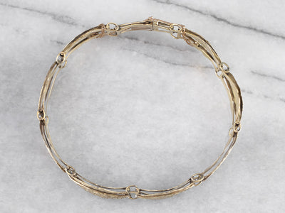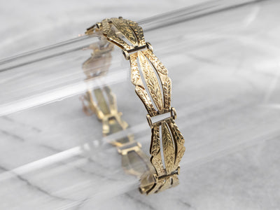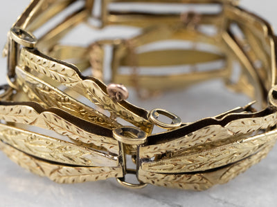 This antique 18 karat gold bracelet features beautifully engraved links that shine in rich yellow 18 karat gold. It is a perfect everyday bracelet and could also be paired easily with similar bracelets as well. This would make a lovely gift for a birthday, anniversary, or other special occasion!