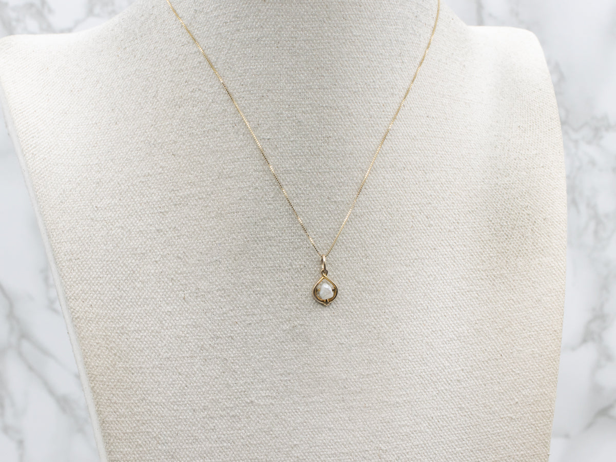 This distinctive pendant showcases a lustrous natural pearl elegantly suspended within a gracefully twisted yellow gold setting, a testament to the artisanal craftsmanship practiced in our New Hampshire studio. Each piece is thoughtfully assembled from carefully curated vintage components, blending timeless design sensibilities with contemporary jewelry-making techniques. The interplay between the pearl's organic luminescence and the warm, refined character of 10-karat yellow gold creates a sophisticated accessory suitable for both everyday wear and special occasions.