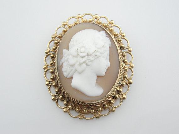 This vintage brooch combines a wonderful classical portrait with an intricate filigree frame. The handmade gold frame is yellow, with layers of twisting rope and bead details. The classical motif is carried over into the lady's hair, with carefully carved roses. Particularly nice here is the ladies face, and her gentle eyes. This can be worn as a pin or a pendant.