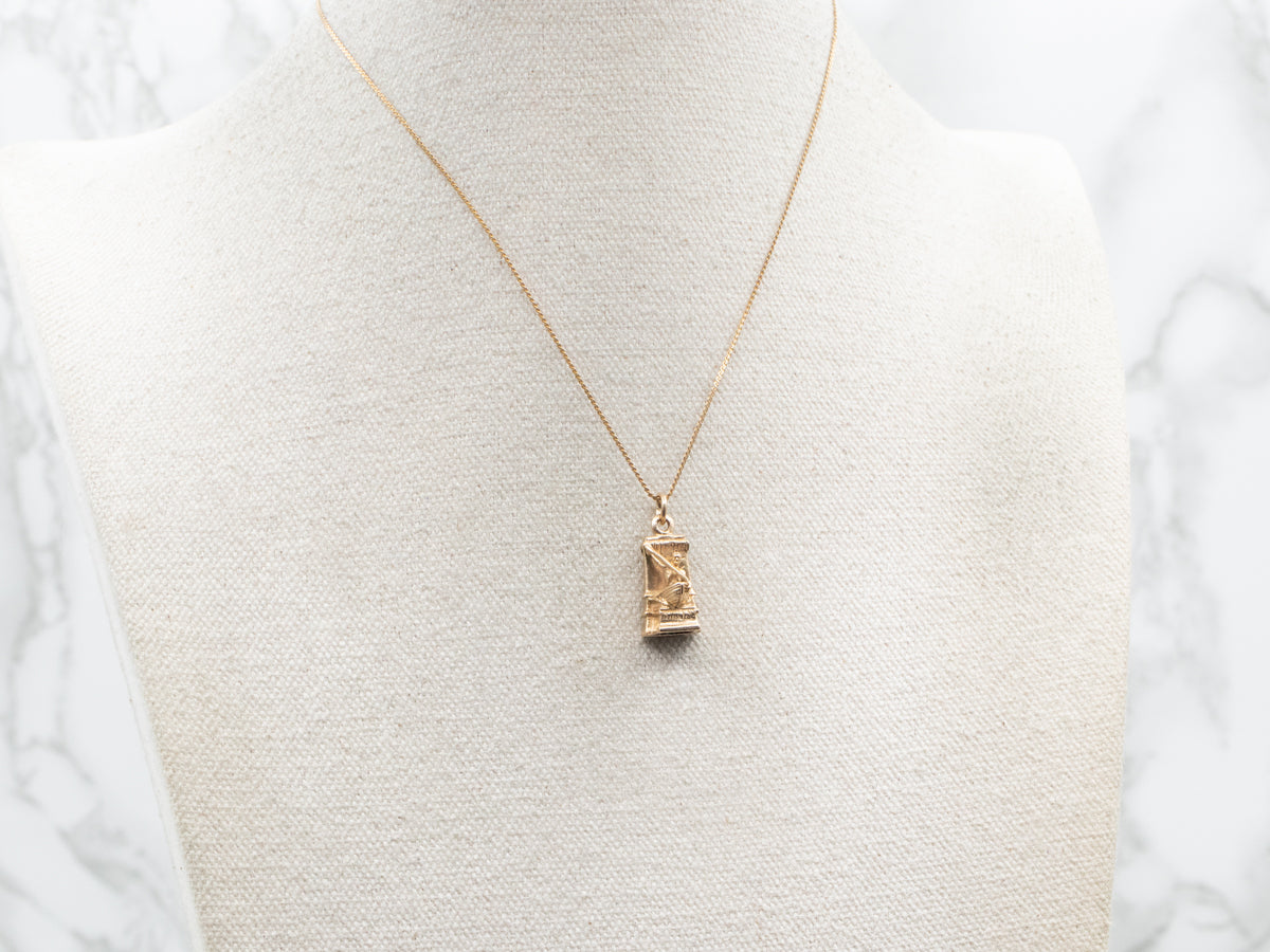 This gold charm features the New Bedford, Massachusetts Whaleman, created by Bela Lyon Pratt, one of America’s most noted sculptors. A prominent resident, William W. Crapo, gifted the statue to the city, and it was unveiled on June 20, 1913, in Library Square. The sculpture stands as a tribute to the hard work and determination of the whalers who helped build the prosperity of the community.