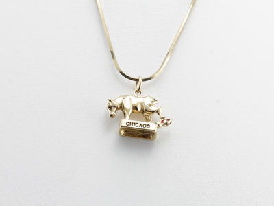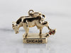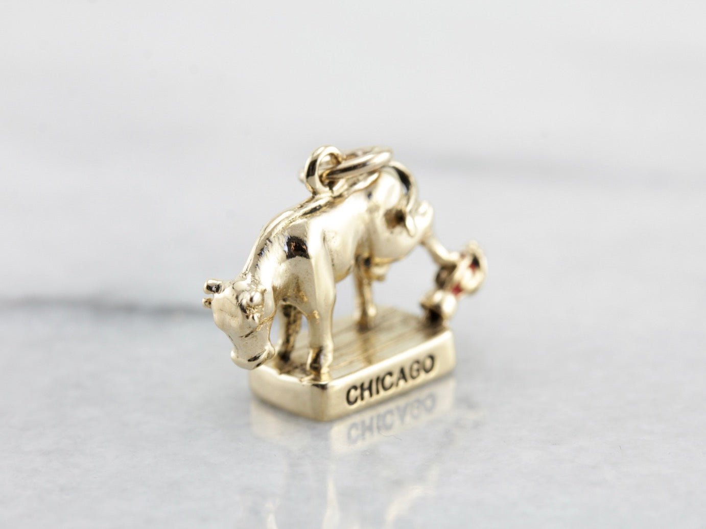 A fire swept through Chicago on October 8, 1871. For decades, the source of the fire has been debated and pondered, as people have wondered what spark began the great conflagration! The prime suspect, depicted here in weighty gold, is Mrs. O'Leary's cow. As the story goes, the cow kicked over a lantern set too close to her hoof, lighting the hay, and eventually the city, ablaze.