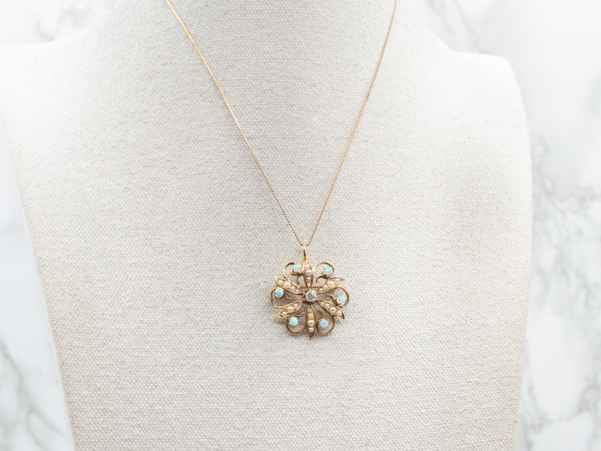 Seed pearls, opals, and an Old Mine Cut diamond beautifully come together to create this elegant design. This piece can be worn as either a brooch or pendant, bringing charming versatility to your collection. Capture the beauty of the Art Nouveau era and turn heads with this brooch or pendant.