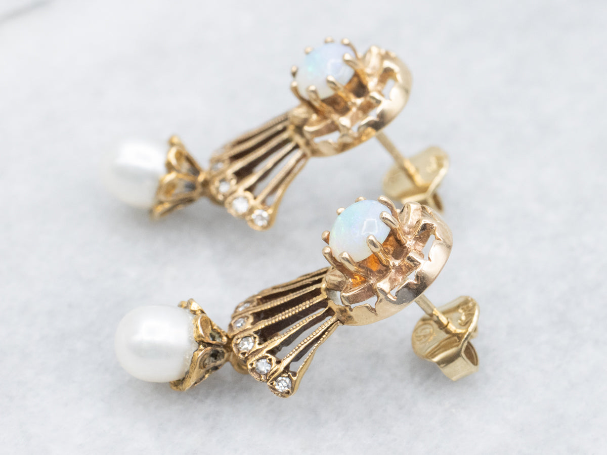 Elevate your jewelry collection with these sophisticated drop earrings, where lustrous pearls and iridescent opals unite in an ornate gold setting. Delicate diamond accents catch the light beautifully, adding refined sparkle to the design. Perfect for special occasions or everyday elegance, these earrings showcase masterful craftsmanship and timeless appeal.