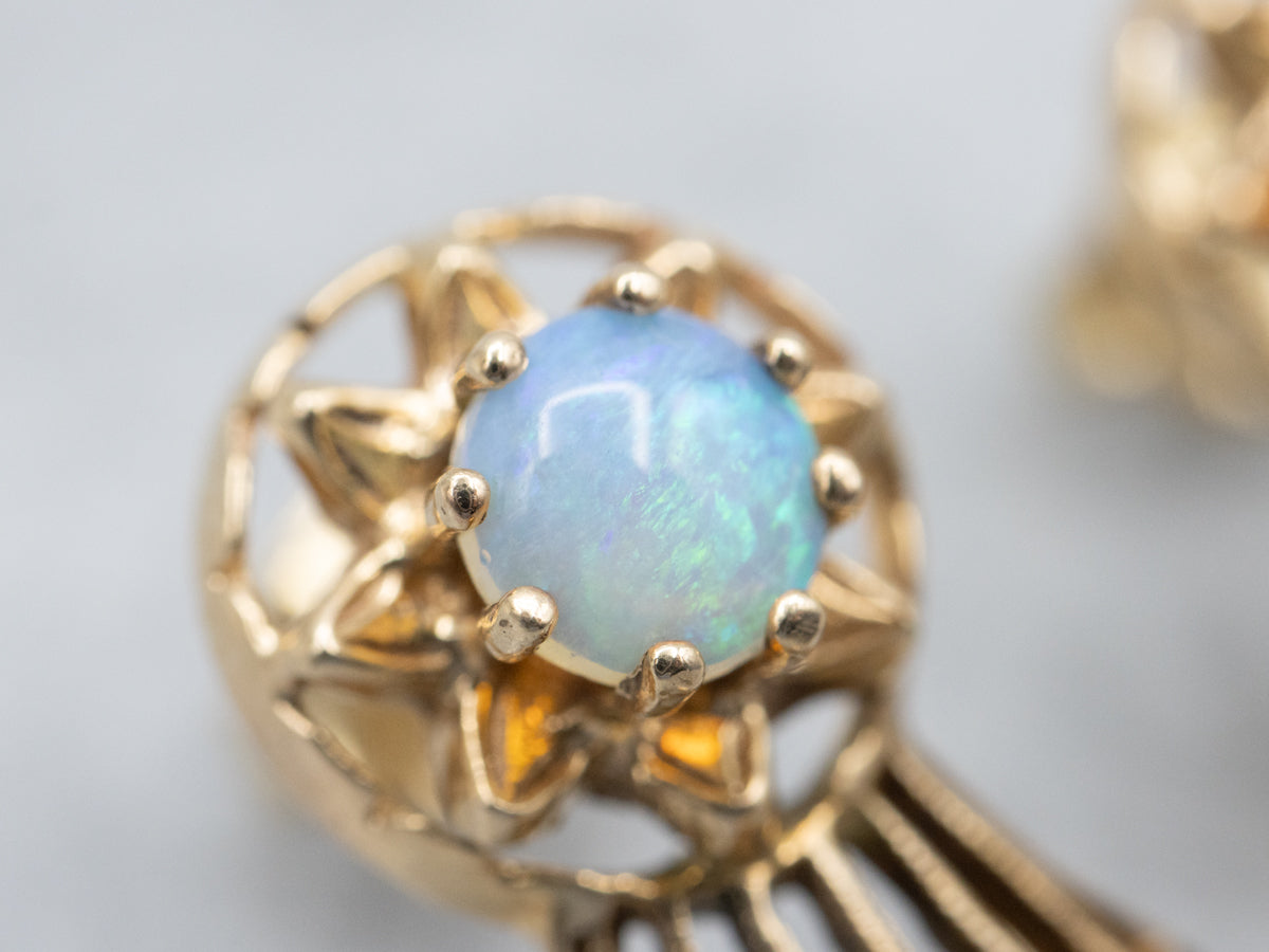 Metal: 14K Yellow Gold Gem: 2 Opals Gem Measurements: 5.0 mm, Round Accents: 2 Pearls, 14 Diamonds totaling .15 Carats, G-I in Color, VS-SI in Clarity Length of Earrings: 28.0 mm Width of Earrings: 12.0 mm Marks: "14 B" Stamped on the findings