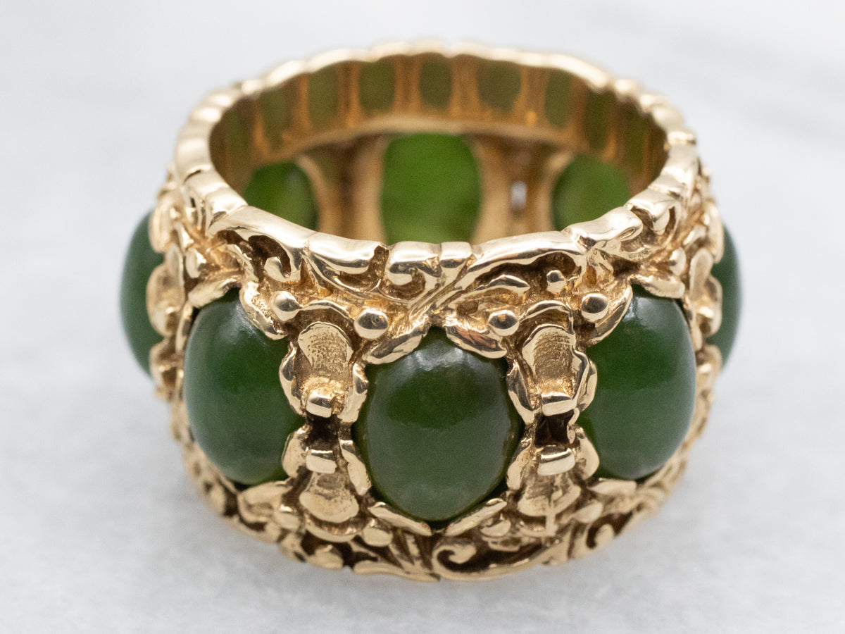 The style of this truly beautiful vintage band is Asian, reminiscent of the metal work done in Thailand and Bali. Eight deep forest green cabochons of jade are bezel set in the ring, creating a lovely compliment to the warm yellow gold.