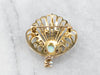 This ornate brooch is fit for a mermaid! Beautifully textured filigree forms a shell design, accented by scrolling motifs that look like crashing waves. Sparkling opals dapple the brooch in ocean blue hues, while the hidden bail allows you to wear this piece as a pendant!