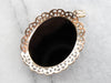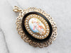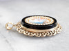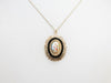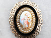 This Victorian Revival pendant is full of fantastic detail! A painted porcelain cabochon depicts a greek figure, likely Dionysus, holding grapes and a goblet. A halo of seed pearls frames the portrait, inset into a black onyx cabochon setting. Ornate gold filigree adds even more visual interest and gives this pendant a royal feel!