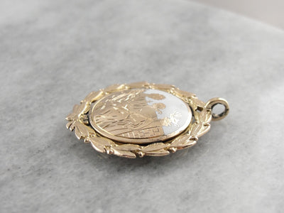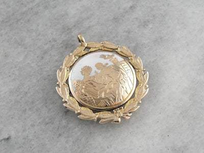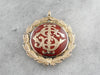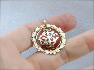 Beautifully crafted, this pendant is quite the historical mystery! The use of laurel to wreath the frame and the style of the enamel lead us to believe this is from the 1930's or thereabouts. The front is deep, crimson red in color, perfectly enameled with a high gloss. A gold monogram sits atop the enamel, itself decorated with small engraving. On the reverse, a scene is depicted in white enamel and engraving, with a Roman man in a toga seeming to consult with a servant.
