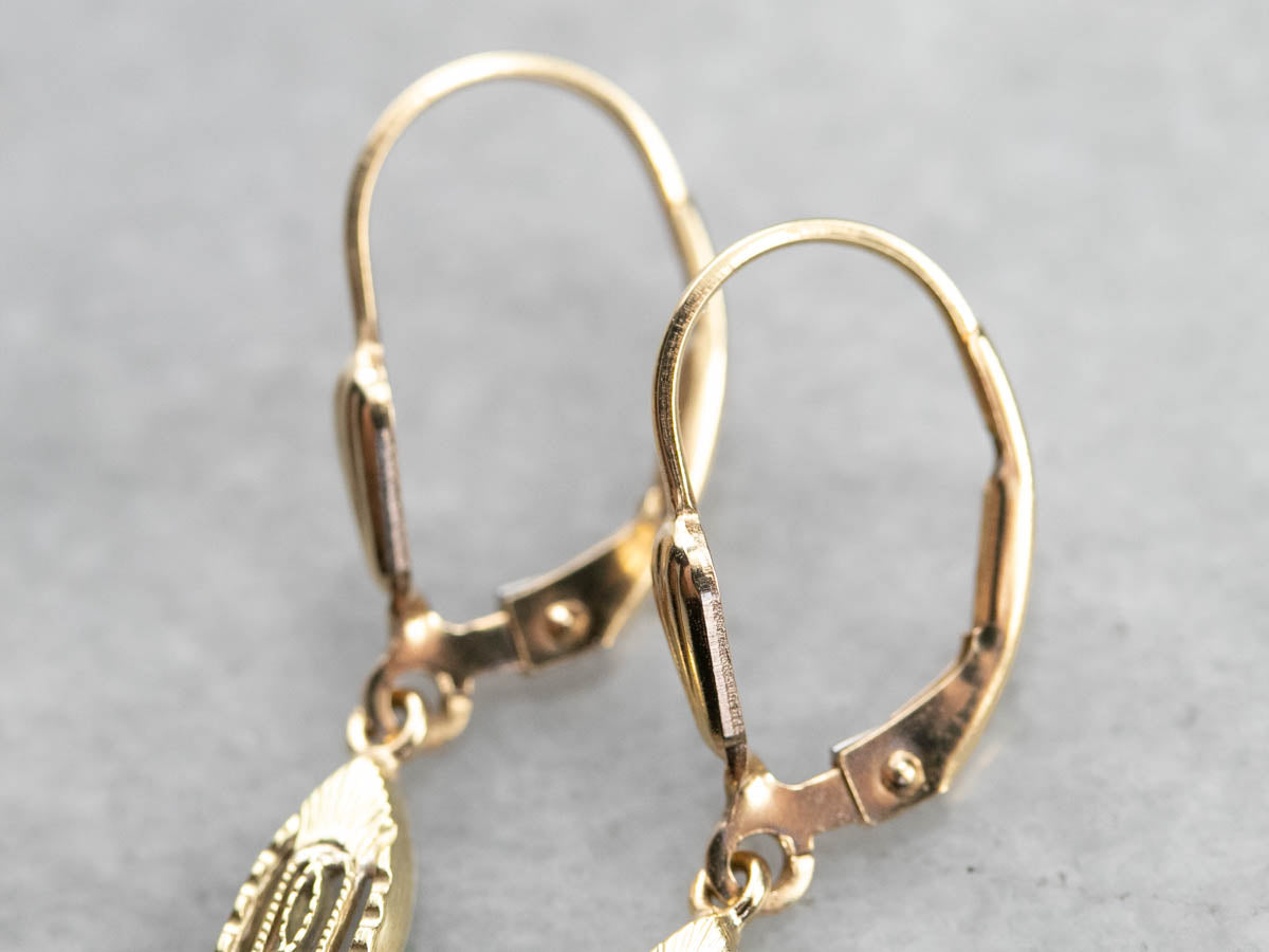Green gold is a hallmark of the early 1900's. It's created when sterling silver is used in the alloying process, giving the gold a soft green glow. We crafted these earrings using a long bar pin from the Art Deco era, and accented them with tiny pearls to bring a sense of softness to the structural filigree.