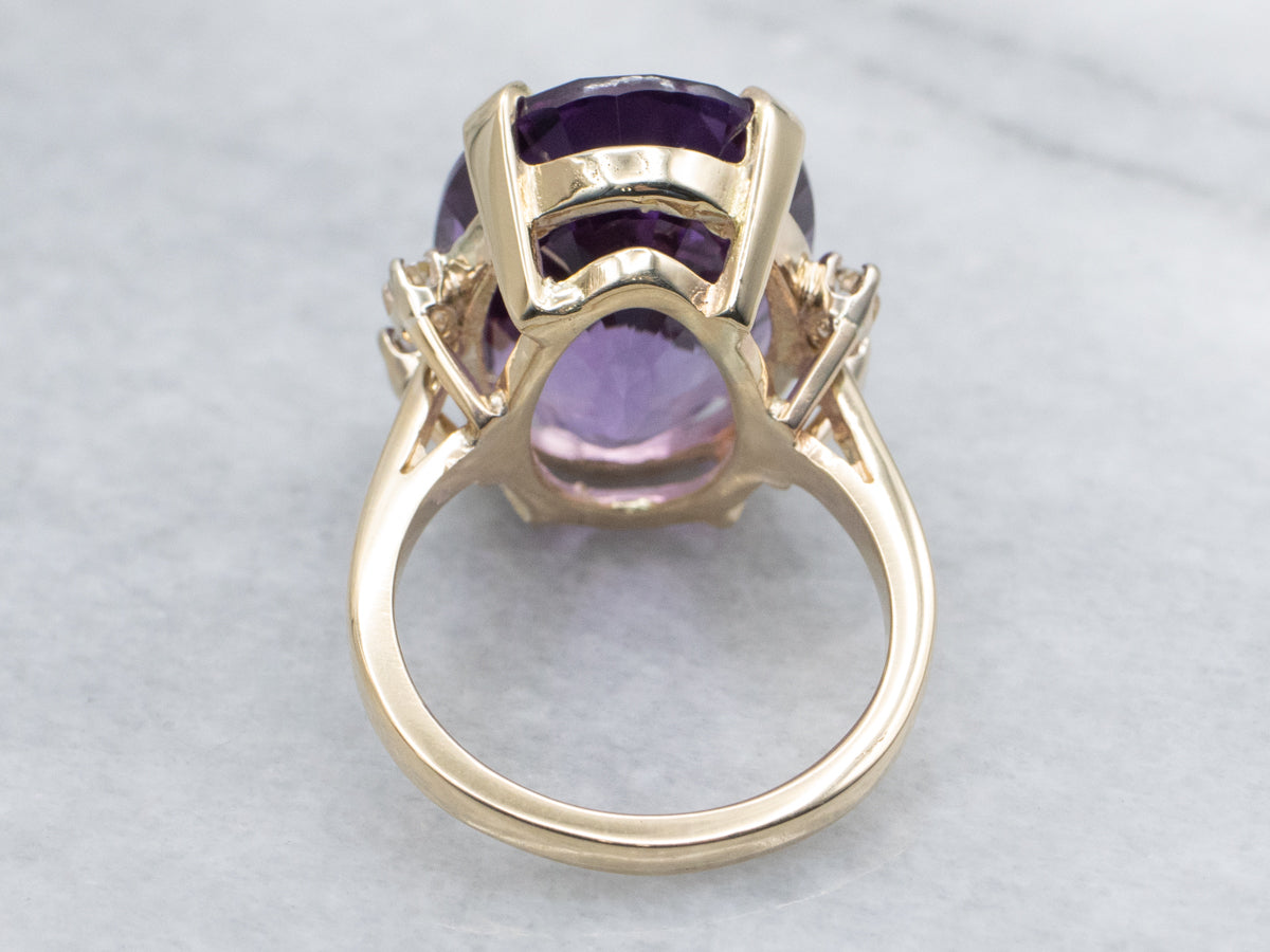 Metal: 14K Yellow Gold Gem: Amethyst 14.59 Carats Gem Measurements: 13.5 x 19.9 mm, Oval Cut Accents: 4 Diamonds totaling .15 Carats, G-H in Color, VS in Clarity Ring Size: 6.25 Marks: "14K" Stamped on the inside band