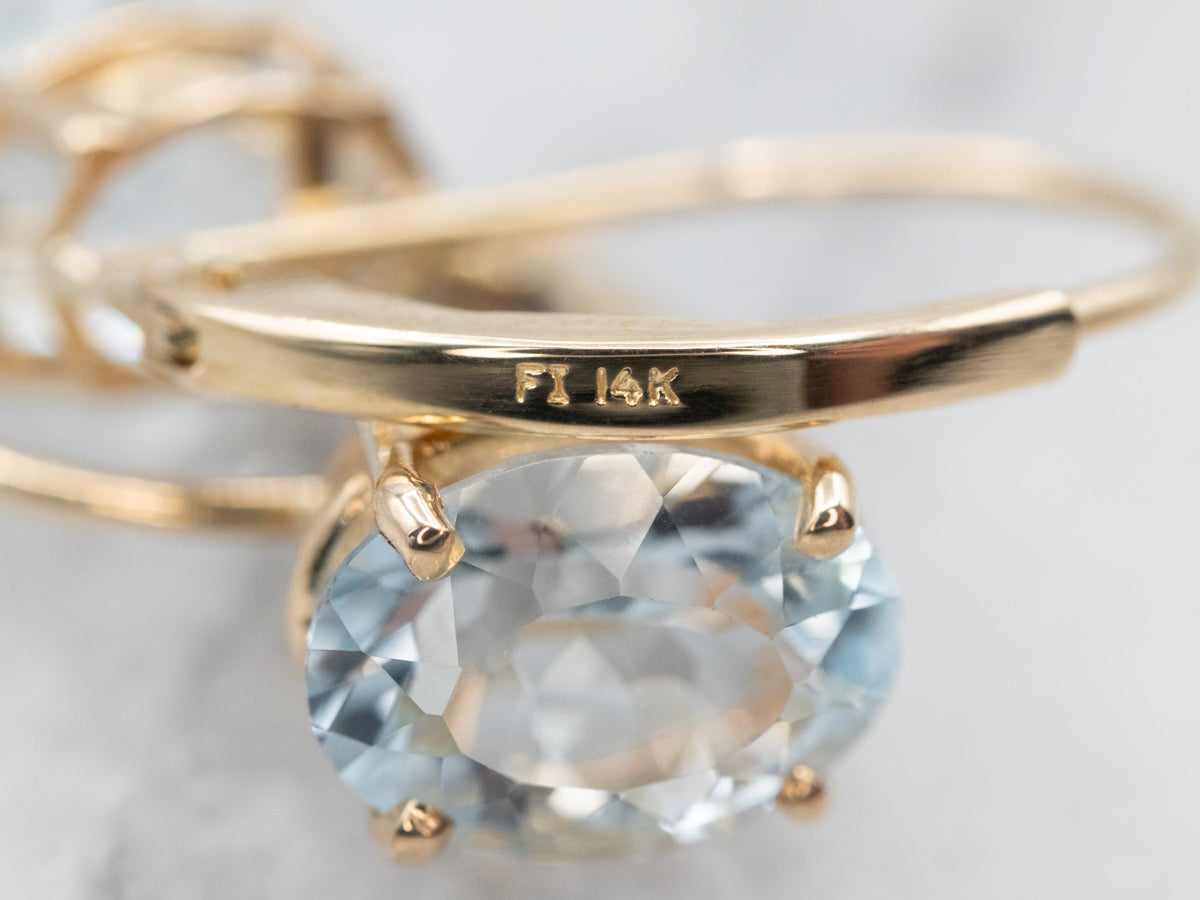 Here we've set fine aquamarine in simple baskets of 14-karat yellow gold. The open back allows light through the entire stone, accentuating the superb cutting of these bright gems! At the very top are the earring wires, and sleek lever backs which are comfortable to wear and very secure!