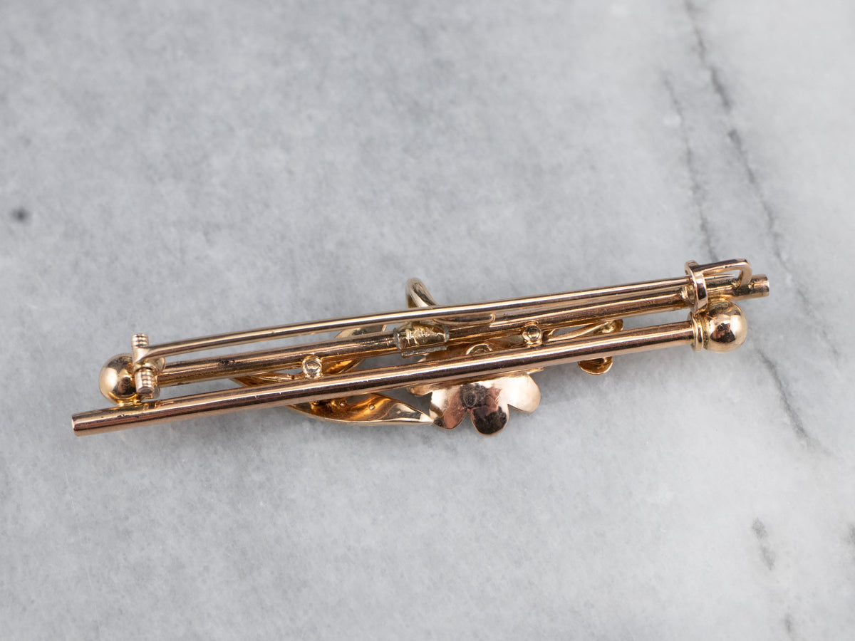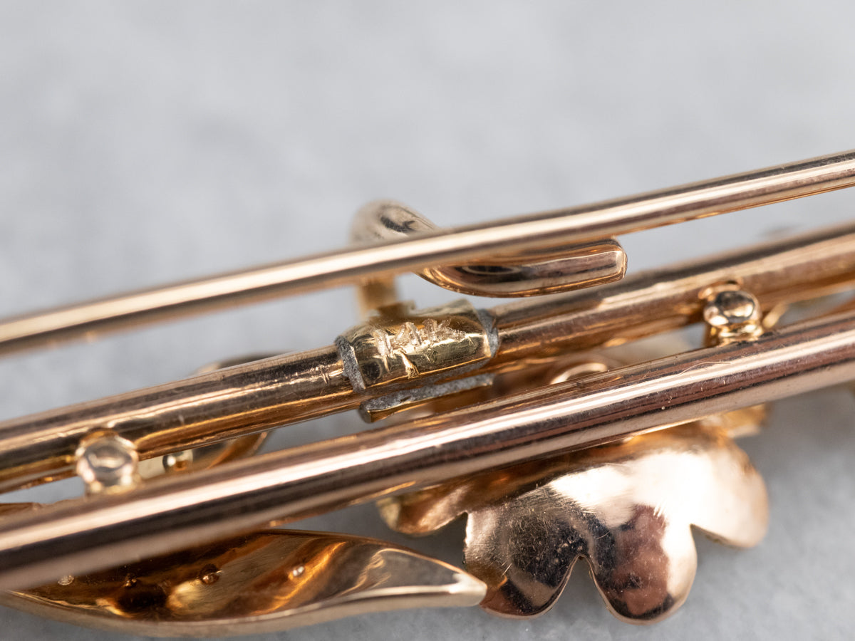 This early 1900s bar pin is in the Victorian style, with a natural, floral motif. Individual stamen and a textured flower have been formed of yellow gold and set with a bright, glittering diamond. Bright turquoise and seed pearl gemstones finished off the botanical elements of this pin. The workmanship is exquisite, and this piece is beautiful in every way! Feminine and dreamy, this pin will look lovely worn on a lapel or sweater... or even on a wedding veil or bouquet ribbon!