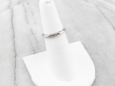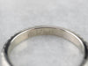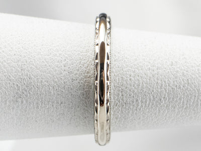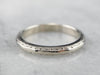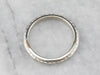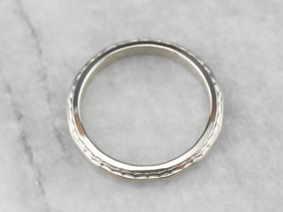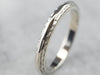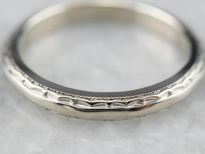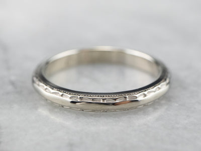 This vintage wedding band has a textured pattern that creates a beautiful play of light! Crafted of 14 karat white gold, this ring has a bright polish and a thin profile, while still being sturdy and ready to last for years to come.