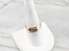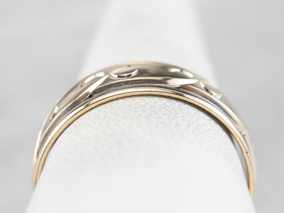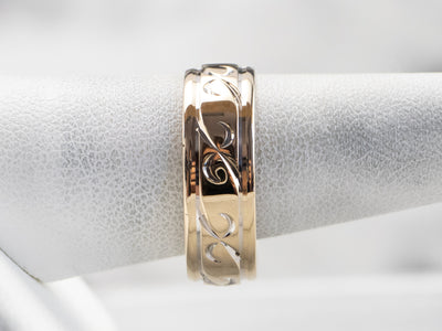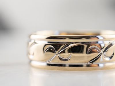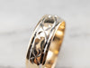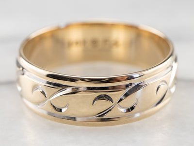 This wedding band has a crisp, polished pattern that plays off two different colors of gold to marvelous effect! Sleek and stylish, this ring would also be worn as an everyday band.
