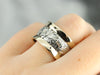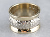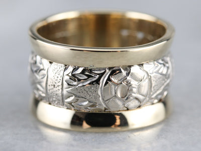 This wide two tone gold band makes a real statement on the hand! It has a lovely floral pattern engraved around the entire piece, making it lovely no matter which way it turns. The contrasting yellow gold border creates a bold look against the ornate pattern of the white gold.