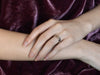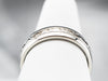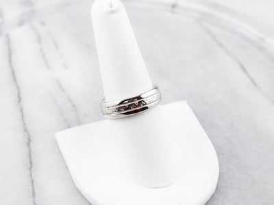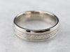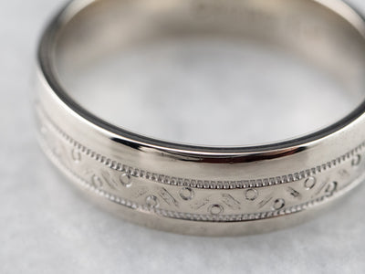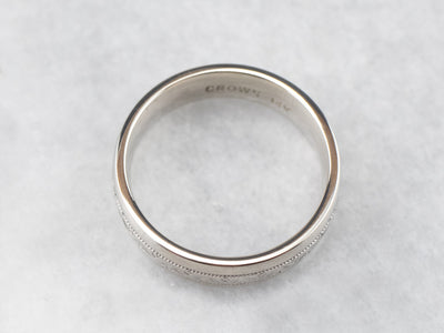 A simple, hefty, but well-defined dot and linear pattern along its center of this vintage wedding band. The top of the ring has just the slightest curve to it, while the inside has a soft, rounded, comfort fit. Suitable for a man or a woman, this ring can be worn as a wedding band, a stacking ring, or an everyday piece.