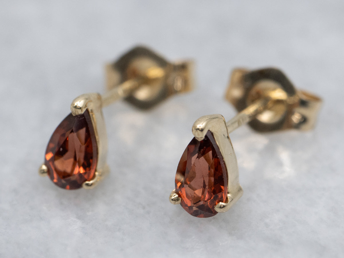 These elegant stud earrings feature lustrous pear-cut garnets set in warm yellow gold, offering timeless sophistication. The distinctive pear shape creates a refined silhouette that complements any complexion, while the deep crimson hue of genuine garnet adds warmth and character. Expertly crafted for everyday wear or special occasions, these studs deliver understated luxury with enduring appeal.