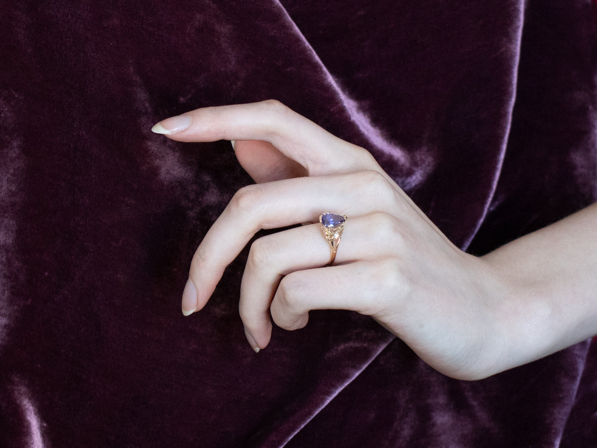 This tanzanite ring is feminine and elegant! The tanzanite is a saturated lavender hue, in a pear cut that mimics the curves along the shoulders of the ring. Diamond accents add even more sparkle to this pretty ring!