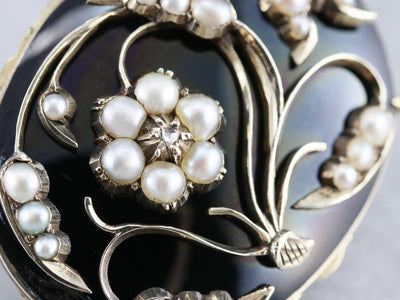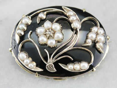 Quite possibly French, this piece has the feel and manufacturing style of France in the late 1800s. This is an outstanding enameled piece, pierced in places and wired through with lovely seed pearls. A small diamond is centered in the single blossom, and a locking, secure pin clasp has been added to this antique brooch.