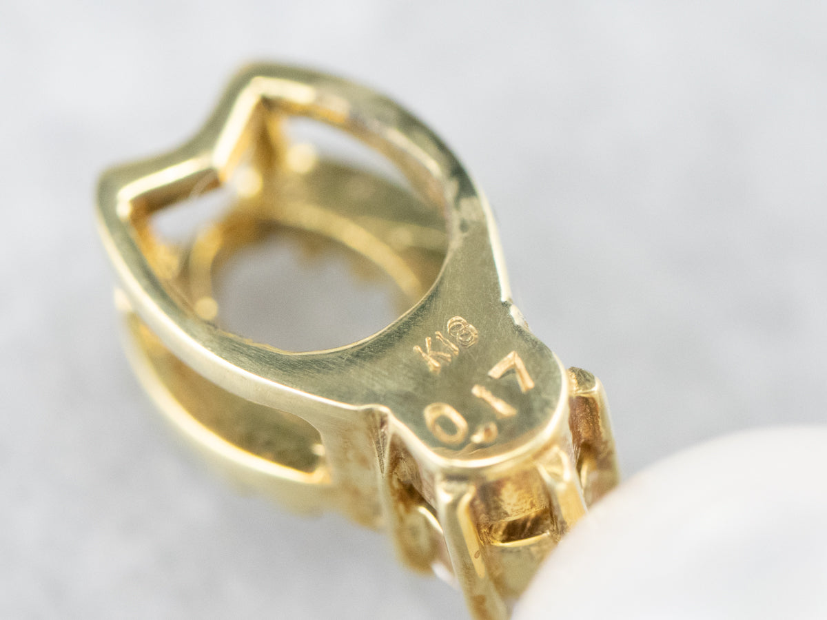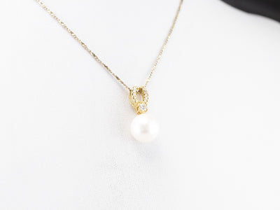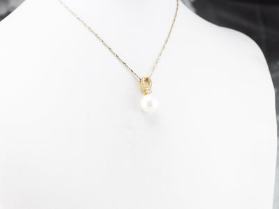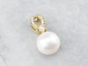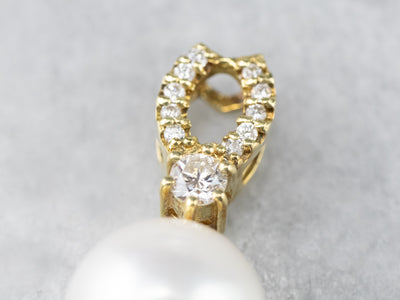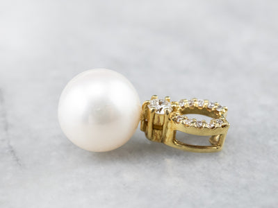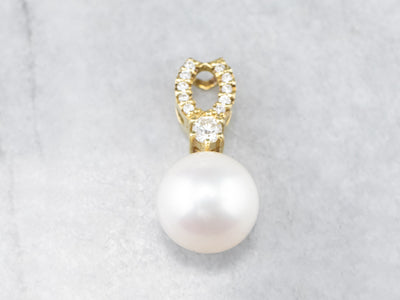 This pendant is simple, yet luxurious! Crafted of rich, 18 karat gold, this pendant is set with a classic white pearl and enhanced with rows of bright and sparkling diamonds. Easy to wear, this pendant transitions nicely from the office to a night out!