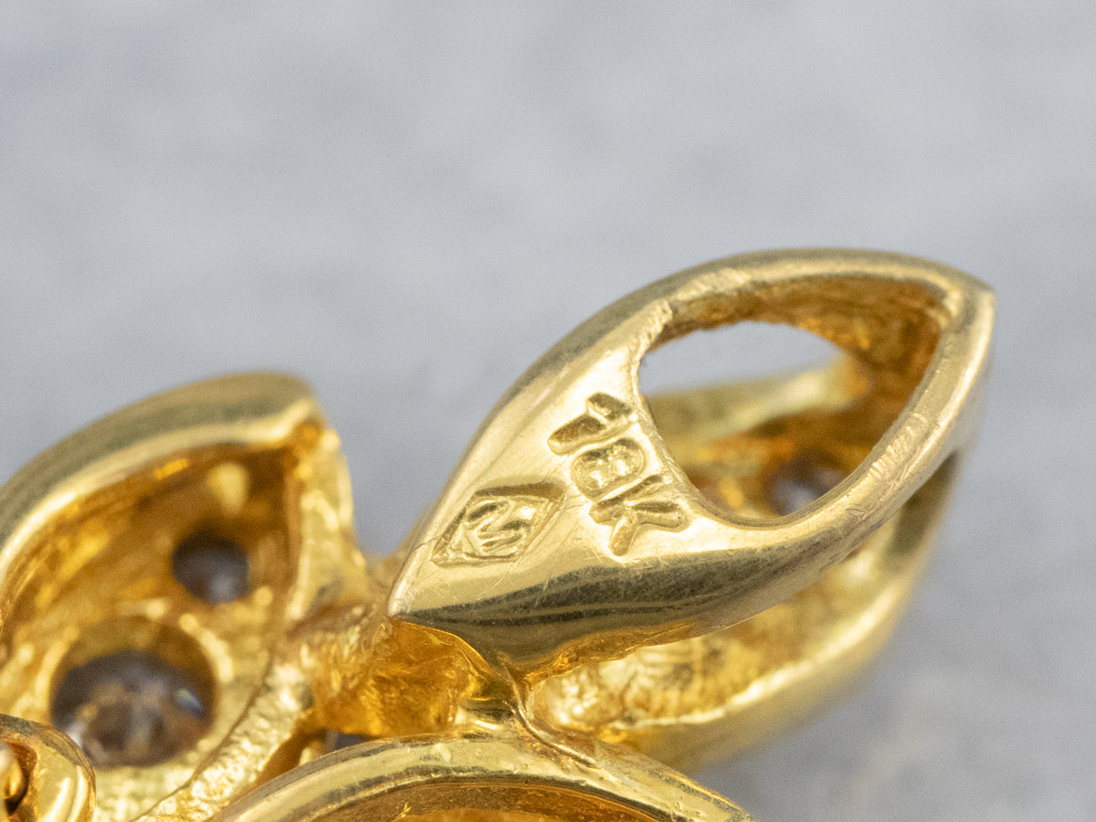 This pearl and diamond pendant is so luxurious! Leaf shaped settings encrusted with diamonds fall in a glittering cascade, giving the pendant a romantic, botanical feel. A shimmering white pearl completes this lovely pendant!