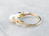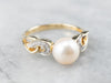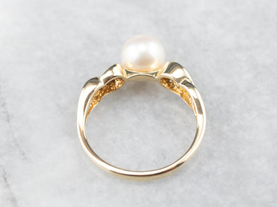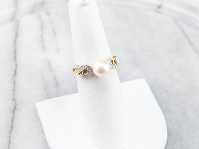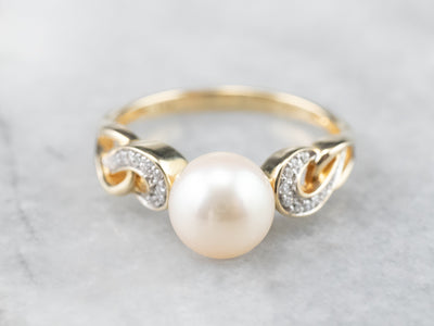 This pearl ring is feminine and elegant! The pearl is a sophisticated, shimmering white, complimented on either side by scrolling waves of glittering diamonds. Classic, yet stylish, this ring would make a great gift!