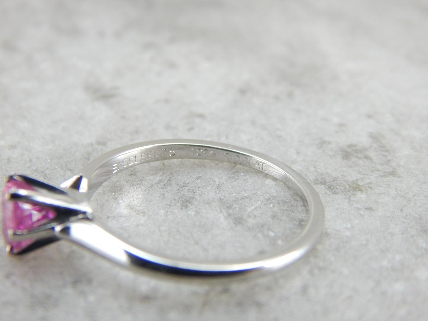 The focal point of this ring is absolutely the bright, rich, glowing pink sapphire we've set at the center! The simple engagement mounting is the perfect frame for this hot stone, and will set nicely next to a variety of wedding band styles. The stone is from Sri Lanka, also called Old Ceylon. Sri Lanka is the source of the finest sapphire in the world, and this stone is no exception.
