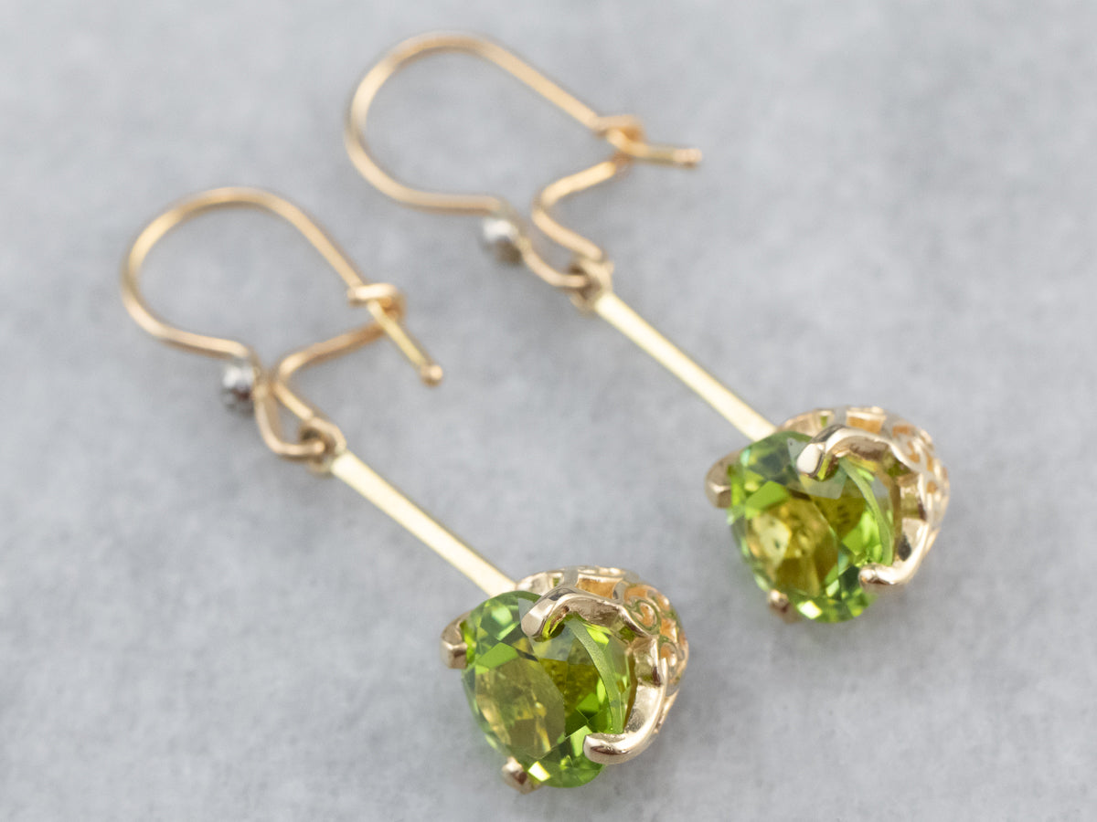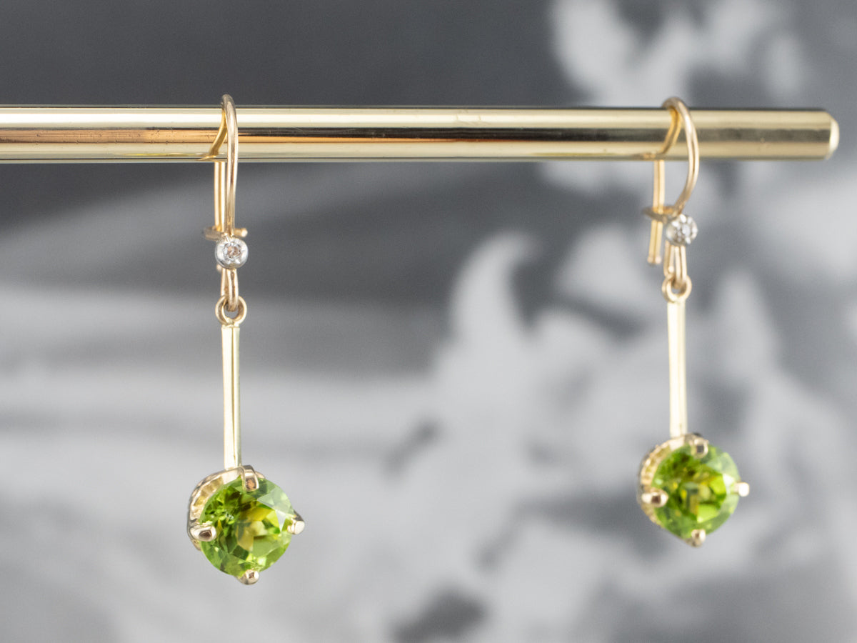 These simply designed earrings are lovely! Vibrant green peridots sparkle intensely beneath polished bars of 14 karat gold. Tiny diamond accents add a touch of sparkle to the findings.