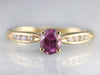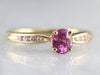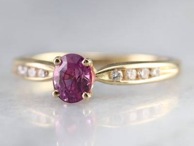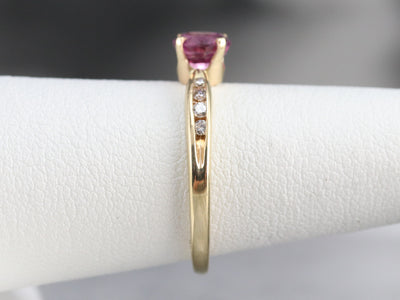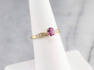 Finely crafted, this yellow gold mounting came to us without stones. Rather than a traditional diamond, we chose to set this lovely piece with one of our finest Ceylon Sapphires. This stone is rich with color, a soft pink reminiscent of springtime cherry blossoms!