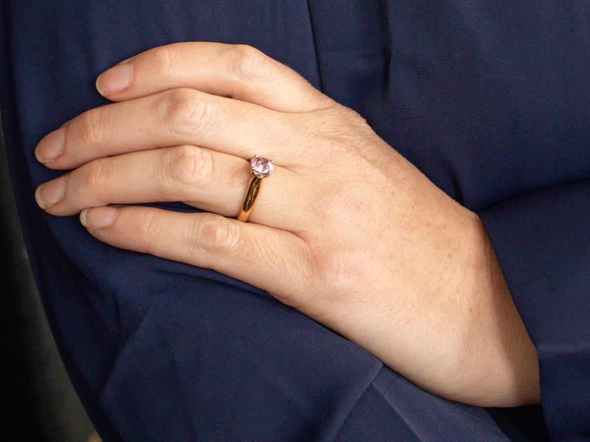 This pink sapphire solitaire ring is sweet! The gem is a pretty lavender pink hue, with flashes of raspberry and fushia. The mounting is crafted of high polished 18-karat gold, set into a platinum head securing the stone without detracting from its color. This piece would make an exceptional engagement ring!
