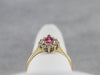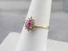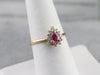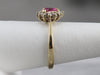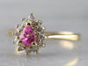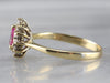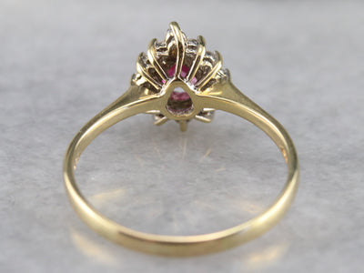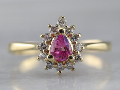 The ultimate classic, a beautiful sweet pink sapphire adorns the center, surrounded by a crown of diamonds! The stones are all set into yellow gold, and the band finishes off the ring with a polished gold shank. Worn as an engagement, anniversary or birthstone ring, this is a timeless piece sure to be an heirloom in the making!