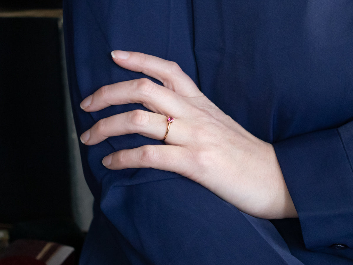 This ring is the perfect blend of elegance and playfulness! We've set this vibrant round-cut pink tourmaline into a classic yellow-gold antique solitaire setting, sweetly styled we think this would make a perfect birthstone piece!